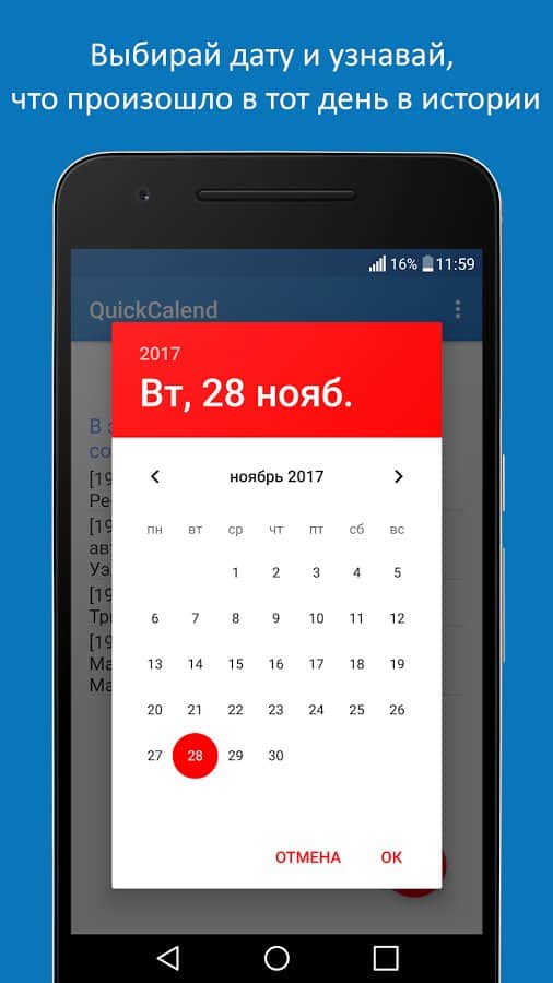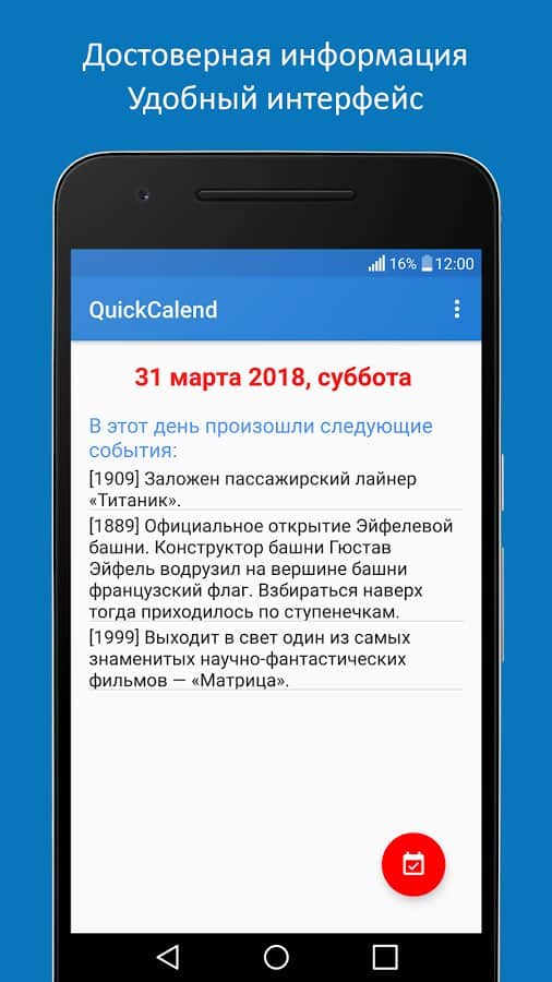 QuickCalend - çok basit ama oldukça faydalı bir uygulama, içinde birçok farklı tatil barındırıyor. Elbette bu sıradan bir takvim, ancak her gün o günde hangi tatillerin olduğunu görebileceksiniz, hepsi detaylı bir şekilde açıklanmış ve her gün yeni bilgilerle güncelleniyor. Genel olarak uygulama oldukça basit ve yer kaplamıyor, ayrıca standart takviminizin yerini alabilir veya ona güzel bir ek olabilir.