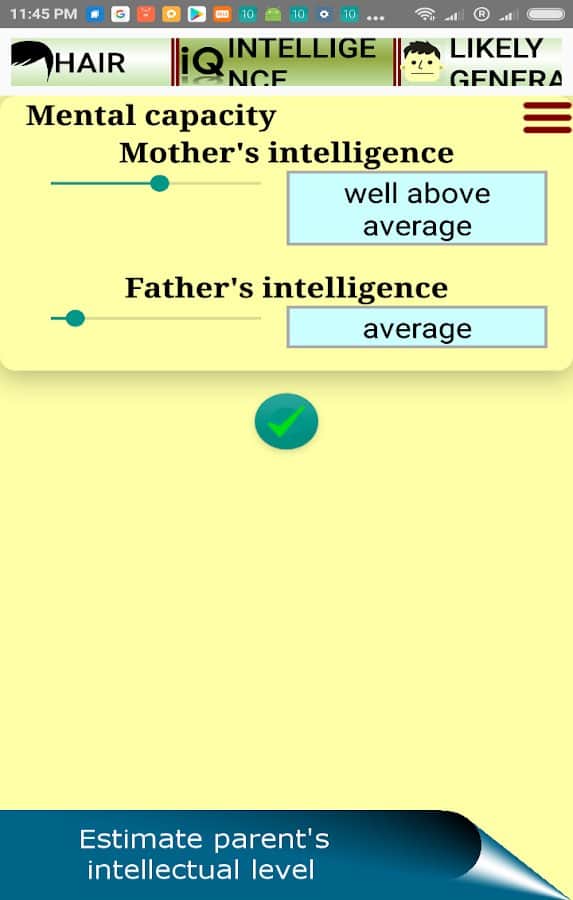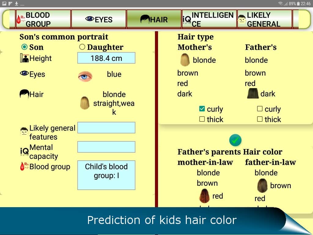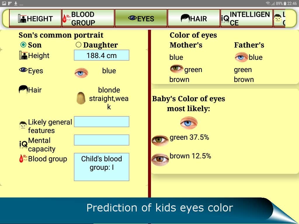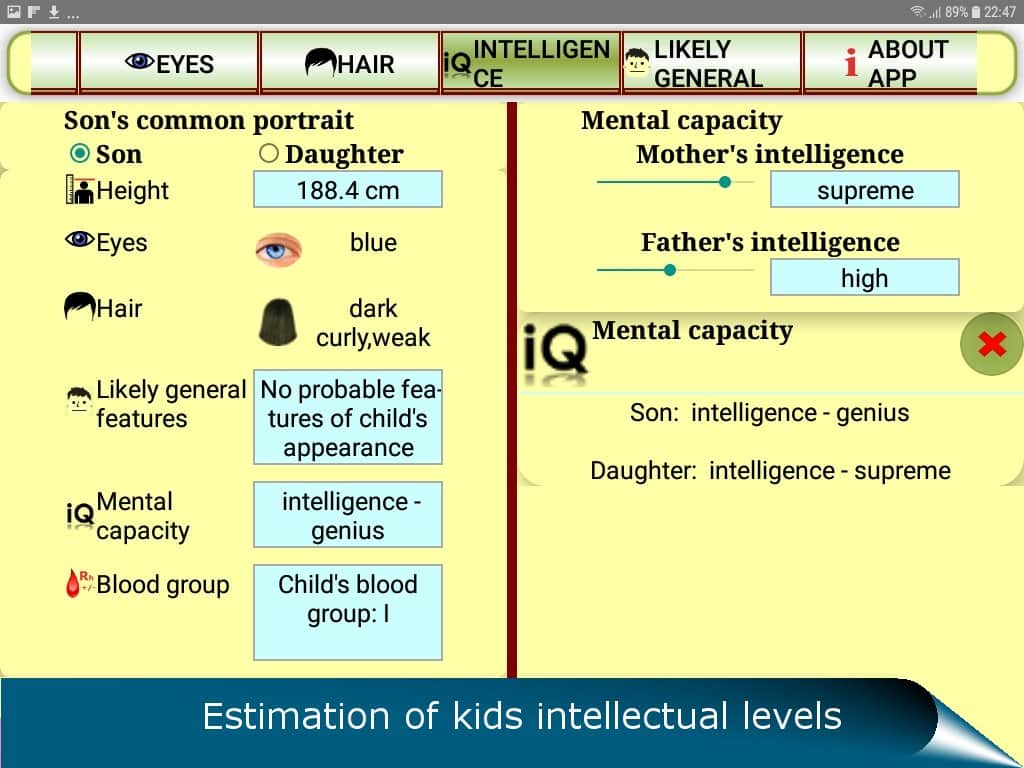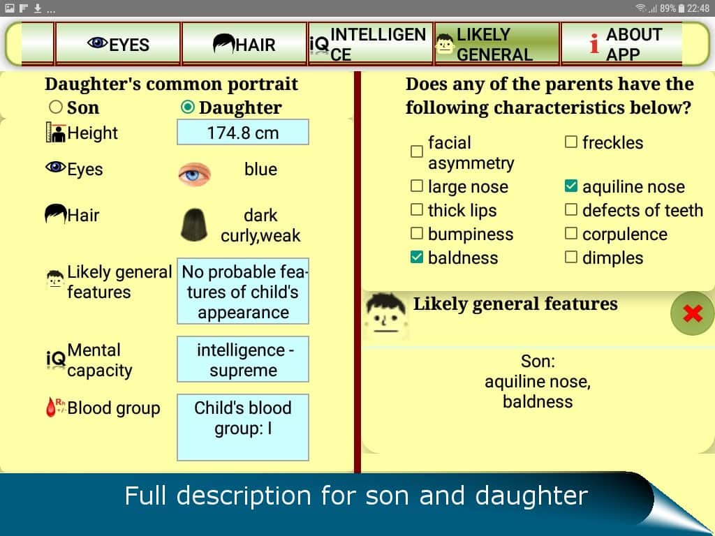 QUIS gelecekteki çocuk için bir tahmin uygulamasıdır - meraklı gelecekteki ebeveynlerin hoşuna gidecek bir uygulama. Elbette, bir çocuk bekleyen her çift, 'Çocuk benim burnumu mu alacak? Yoksa benim göz rengimi mi? Yoksa bizden çok, büyük anne ve büyük babaya mı benzeyecek?' gibi sorularla kafasını karıştırıyor. Artık bu soruların yanıtlarını öğrenmek için dokuz ay beklemek zorunda değilsiniz. Dominant ve resesif genleri dikkate alarak genetik analiz yapma imkanı doğdu. Bu sayede, aşağıdakileri öğrenebilirsiniz:
