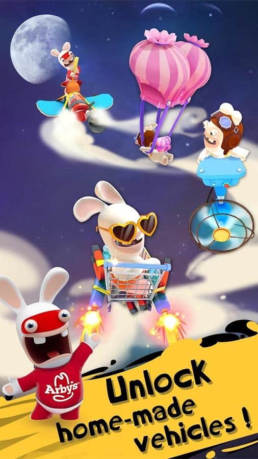 Rabbids Arby's Rush – Android için bir koşu oyunu, burada Ubisoft Entertainment'ın deli tavşanlarını kontrol edeceksiniz, bu tavşanlar Ay'a gitmek istiyor. Tavşanlarımızın aklından Ay çıkmıyor ve şimdi ona ulaşmanın başka bir yolunu buldular. Farklı taşıtlarda koşun, sürün, kayın ve uçun ve çeşitli kostümleri keşfedin. Yol boyunca madeni paraları ve rosbifleri toplayın, bu ihtiyaç duyduğunuz gazı ve roketin beslenmesi için gerekli olanı elde etmenize yardımcı olacaktır. Tüm zorlukları geçin ve Ay'a ulaşan arkadaşlarınız arasında ilk olun.