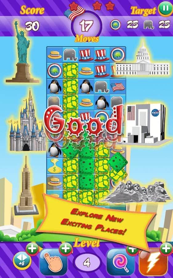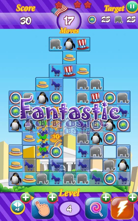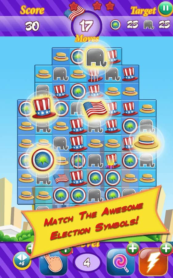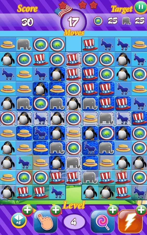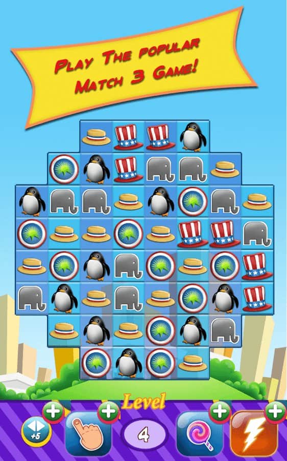 Yarış 2016 - partinize başkanlık seçimlerini kazandırmaya yardımcı olun, bu heyecan verici üçlü eşleştirme türündeki oyunda. Partinizin sembollerinden üç veya daha fazlasını sıraya dizin ve seçimlerde puan kazanın. Seçim aşamalarını başarıyla geçmek ve seçim yarışında size yardımcı olacak maksimum puanı toplamak için tüm mantık düşüncenizi ve tepkilerinizi kullanın. Heyecan verici görevleri tamamlayın ve sembollerden mümkün olan en fazla sırayı oluşturun. Oyunun zorluğu seviyeden seviyeye yavaş yavaş artacak ve puan toplamak sizin için giderek daha zor hale gelecek. Rakiplerinizi geçmek ve liderlik tablosunda en üst sıraya çıkmak için ipuçları ve bonuslardan yararlanın.