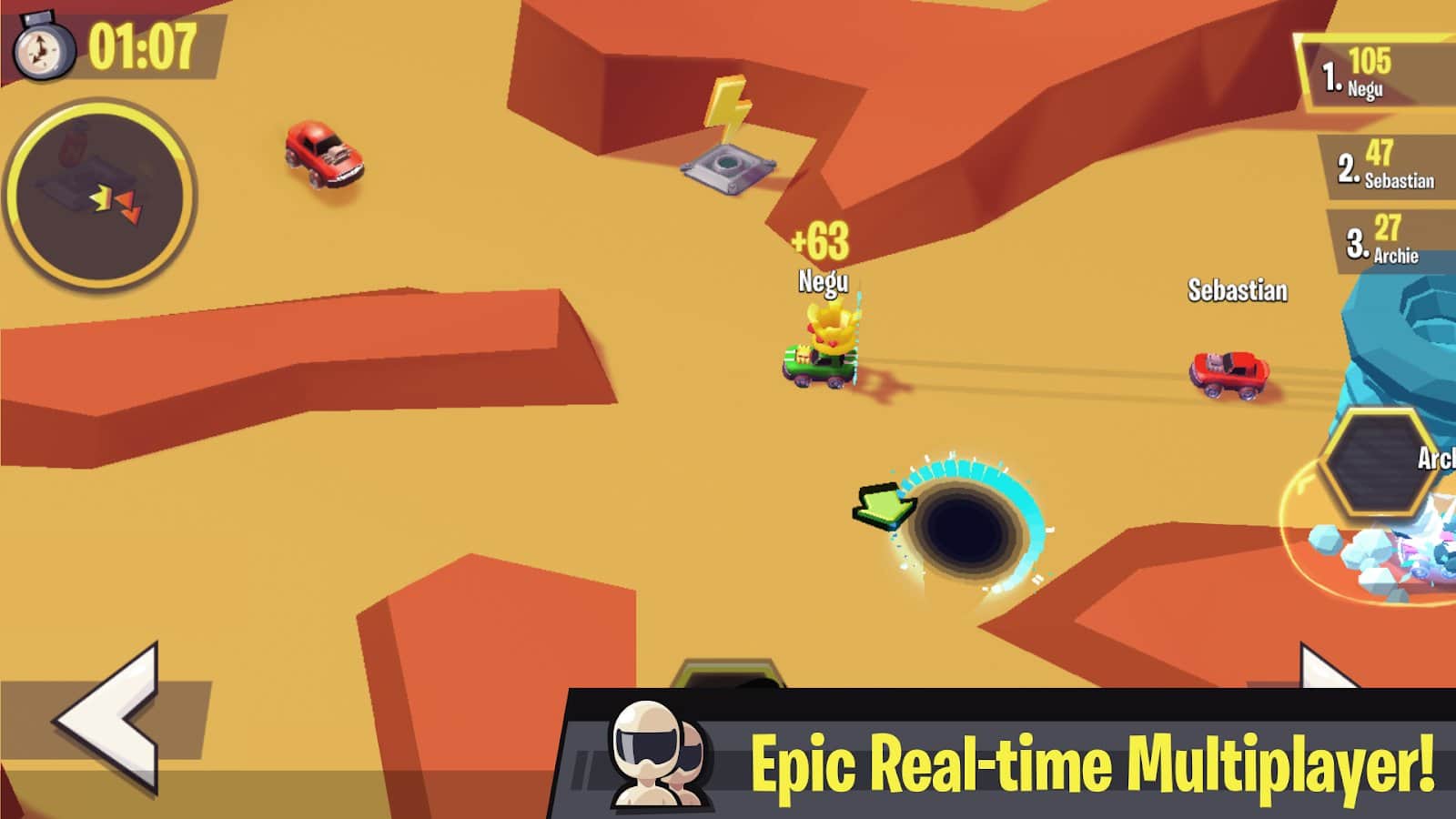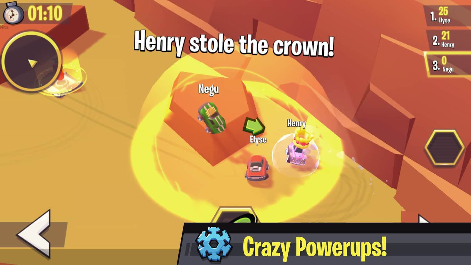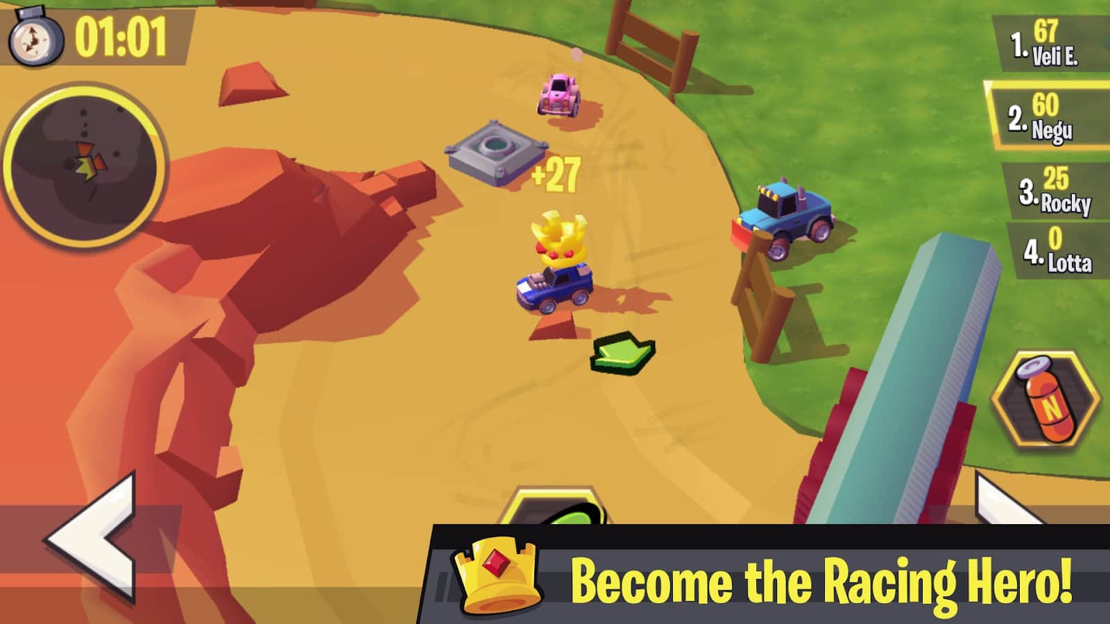 Yarış Kahramanları – dev bir arenada oyuncak arabanızı yönetin ve liderin tacını kazanın. Bu oyundaki ana hedefiniz, liderin tacını kazanmak ve onu mümkün olduğunca uzun süre korumak, rakiplerinize şans tanımamaktır. Gaz pedalına basın ve birçok manevra ve geçiş yaparak arabanızı maksimum hıza çıkarın. Tacı kazanmak için birçok portal ve diğer fırsatları kullanın. Yolda, birçok güçlendirme ve bonus toplaymayı unutmayın ve rekor sonuçlar elde edin. Yeni arabaların kilidini açın ve onları geniş pistte sürün.