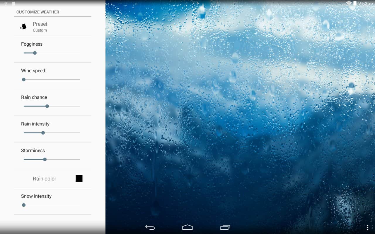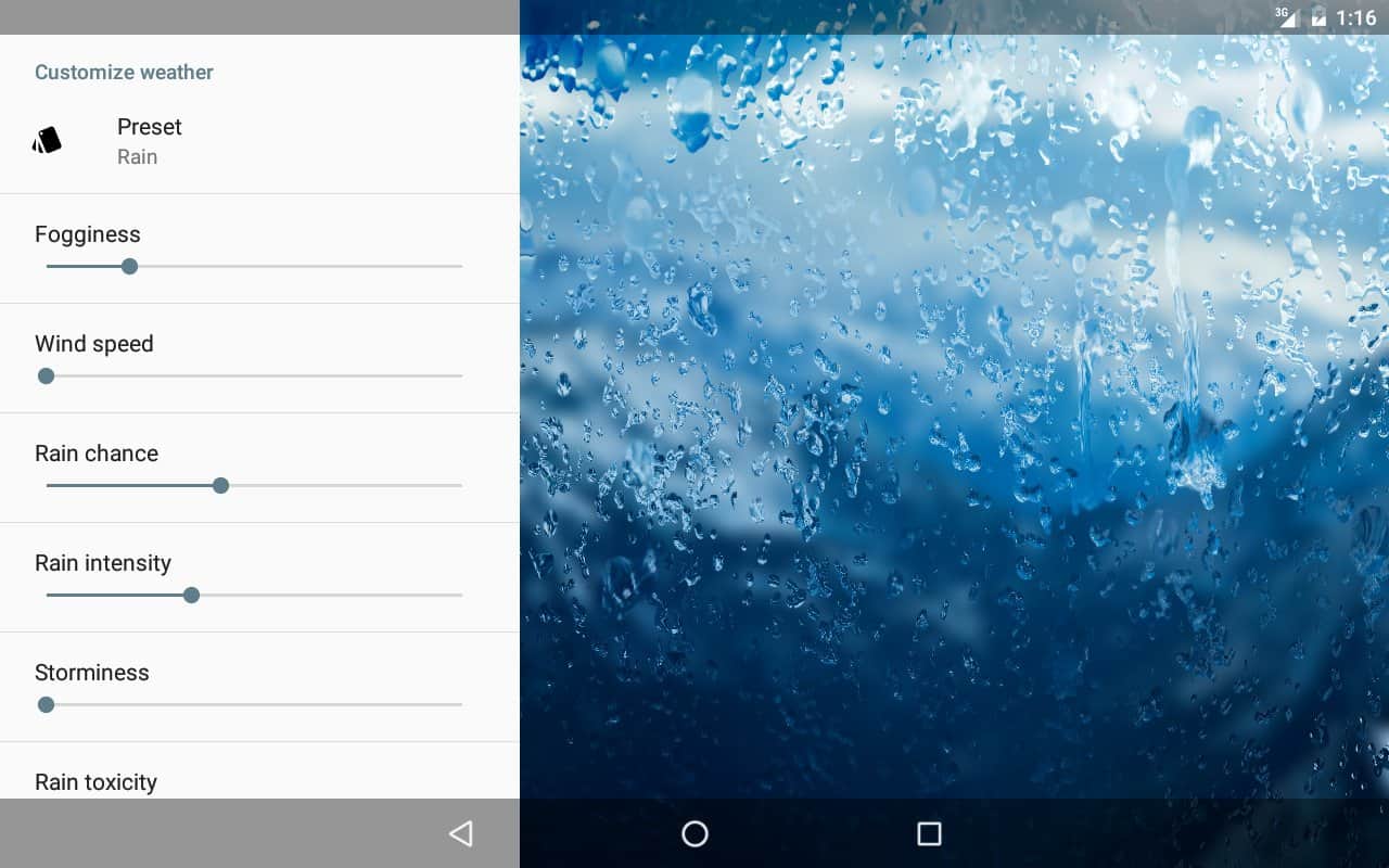 Yağmur kağıdı - Bu canlı duvar kağıtları çok kısa sürede popülerlik kazandı ve bunun nedeni kaliteleri. Amacı, size yağı daha doğru ve gerçekçi bir şekilde aktarmaktır. Hem yağı kendiniz istediğiniz gibi ayarlayabilirsiniz. Yağmurun sıklığını, rüzgarın gücünü, damlaların boyutunu ve hatta yağmurun rengini değiştirebilirsiniz! Kan kırmızısı bir yağmur mu istiyorsunuz? Hiç sorun değil! Bu uygulama ile her şey mümkün. Bu uygulamayı ayarlamak çok kolaydır ve akıllı telefonunuzun ekranında sonsuz yağmurun tadını çıkarabilirsiniz.