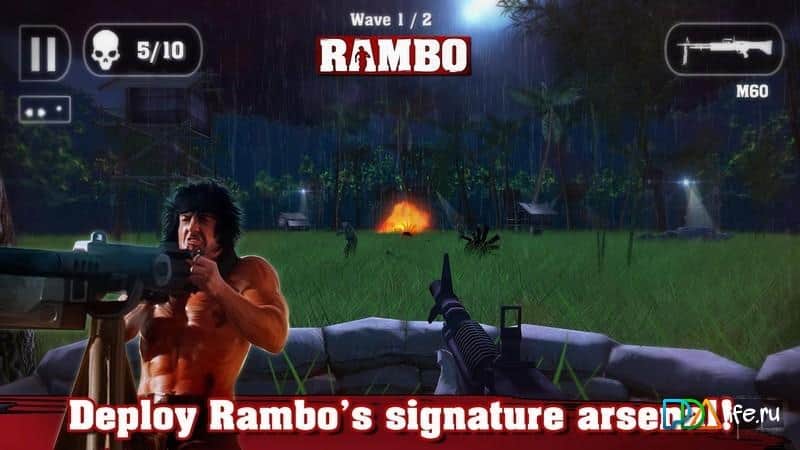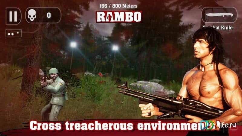 Rambo - John Rambo sayısız düşmanın arasında hayatta kalmaya çalışıyor. Oyun, aksiyon unsurlarıyla dolu dinamik bir koşucu sunuyor. Farklı mekanlarda koşarken, çeşitli silahlarla mümkün olduğunca çok düşmanı öldürmeye çalışıyoruz. Düşman da boş durmayacak, onun emrinde dövüş köpekleri, piyade, tanklar ve hatta helikopterler olacak. Sizin cephaneliğiniz şunlardan oluşabilir: bir Colt, standart bir tabanca, Remington 870 pompalı tüfek, Kalaşnikof AK-47, güçlü ağır makineli tüfek M60 ve tabii ki bir yay. Umut Dağları, Vietnam'ın ormanları ve Afganistan'ın çorak arazilerini keşfedeceksiniz. Ne kadar güçlü olduğunuzu gösterin!