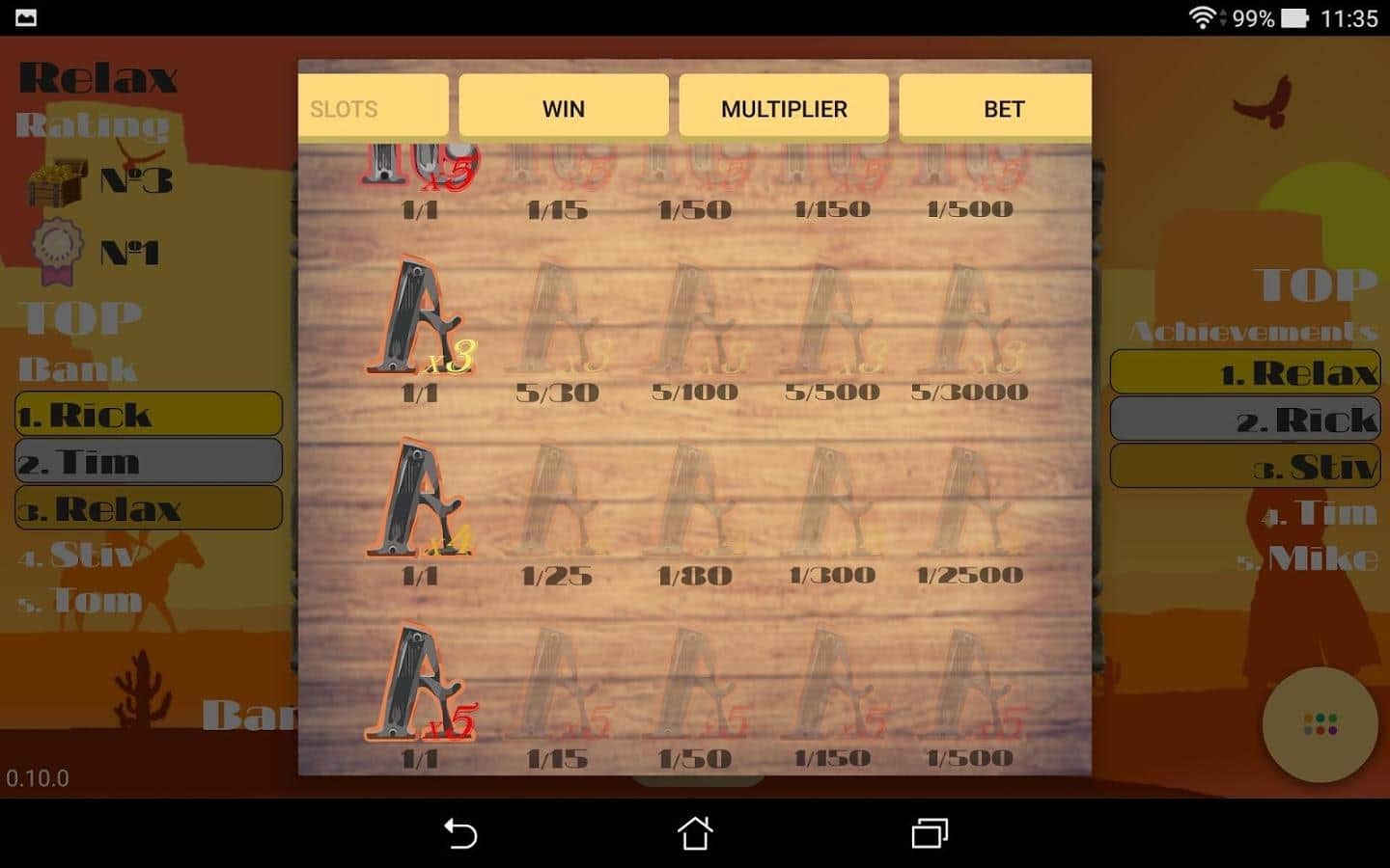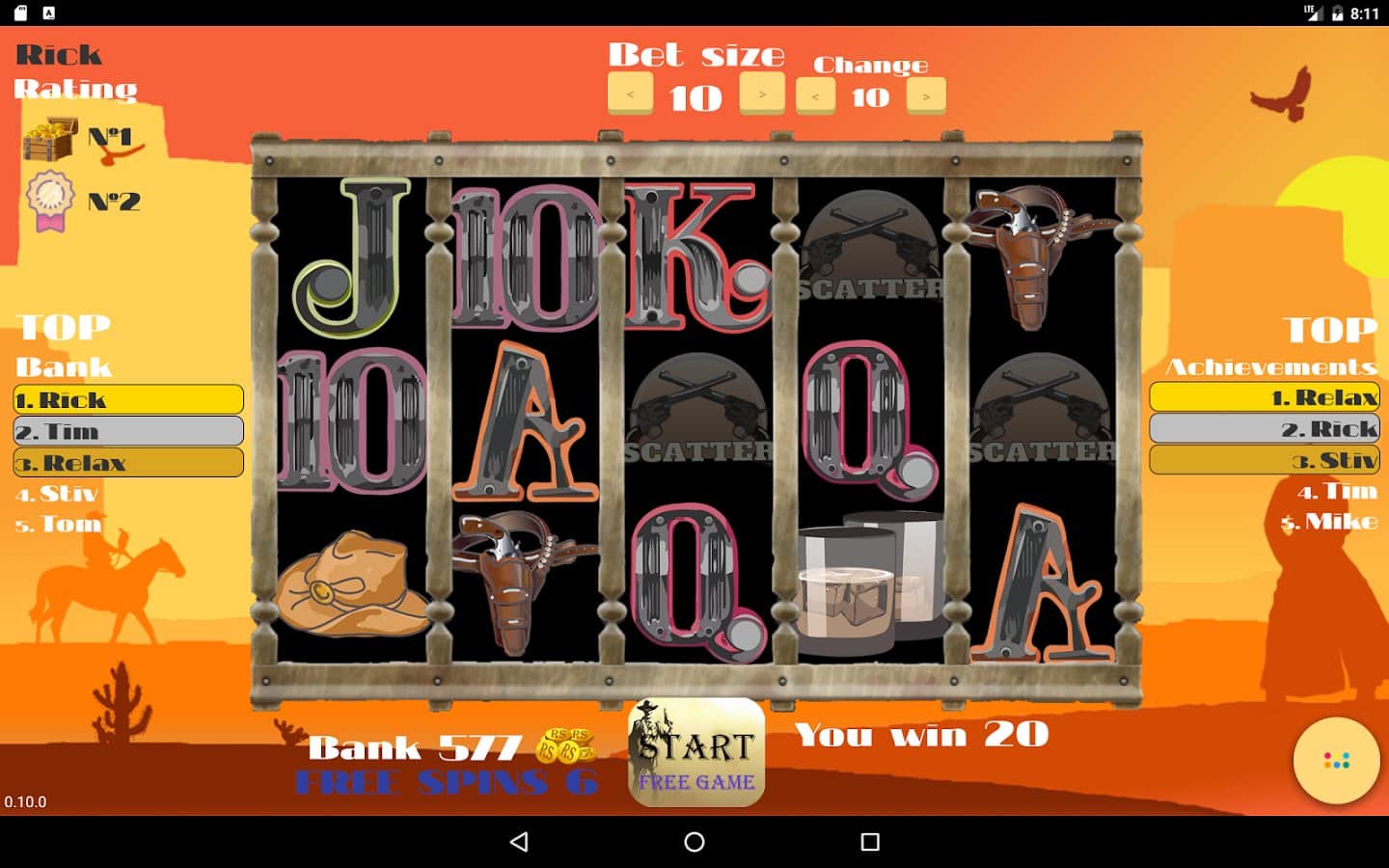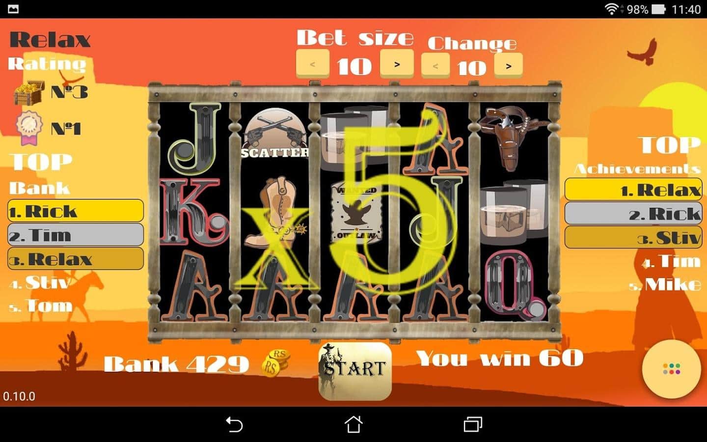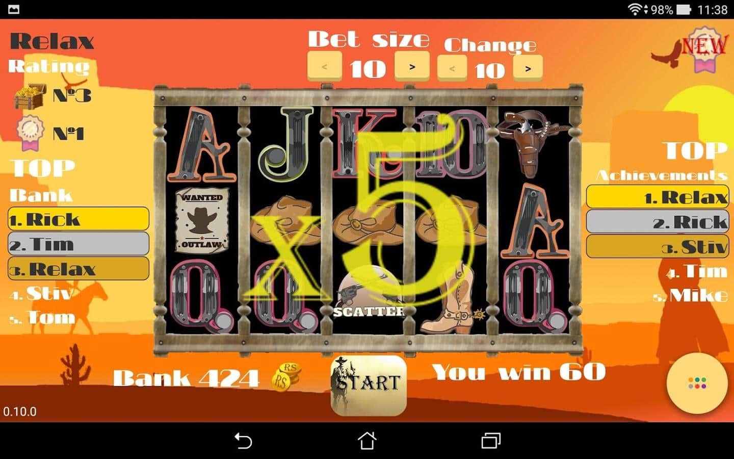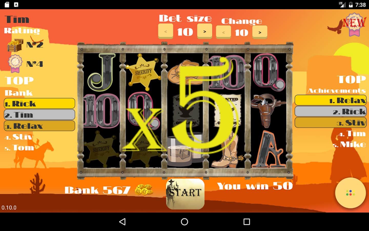 Değerlendirme Slotları – Android için bir slot makinesi, burada şansınızı gerçek anlamda test edebilirsiniz. Bu oyun, ana görevinizin maksimum miktarda madeni para ve başarı toplamak olduğu Vahşi Batı tarzında tasarlanmıştır. Bahislerinizi yapın ve slot makinesini çalıştırın, makaraların döndüğünü ve kazanç hatlarının oluştuğunu izleyin. Oyunda toplam 13 kazanç hattı bulunmaktadır, hepsini elde edin. Lider tablosunda daha üst sıralara çıkın ve burada liderlik pozisyonlarını alın, arkadaşlarınız ve dünya genelindeki diğer oyuncularla yarışın. Her gün sıralama tablosu güncellenecek, bu yüzden fırsatınızı kaçırmayın. Süper oyunu aktive edin ve tüm madeni paraları ve başarıları toplayın.