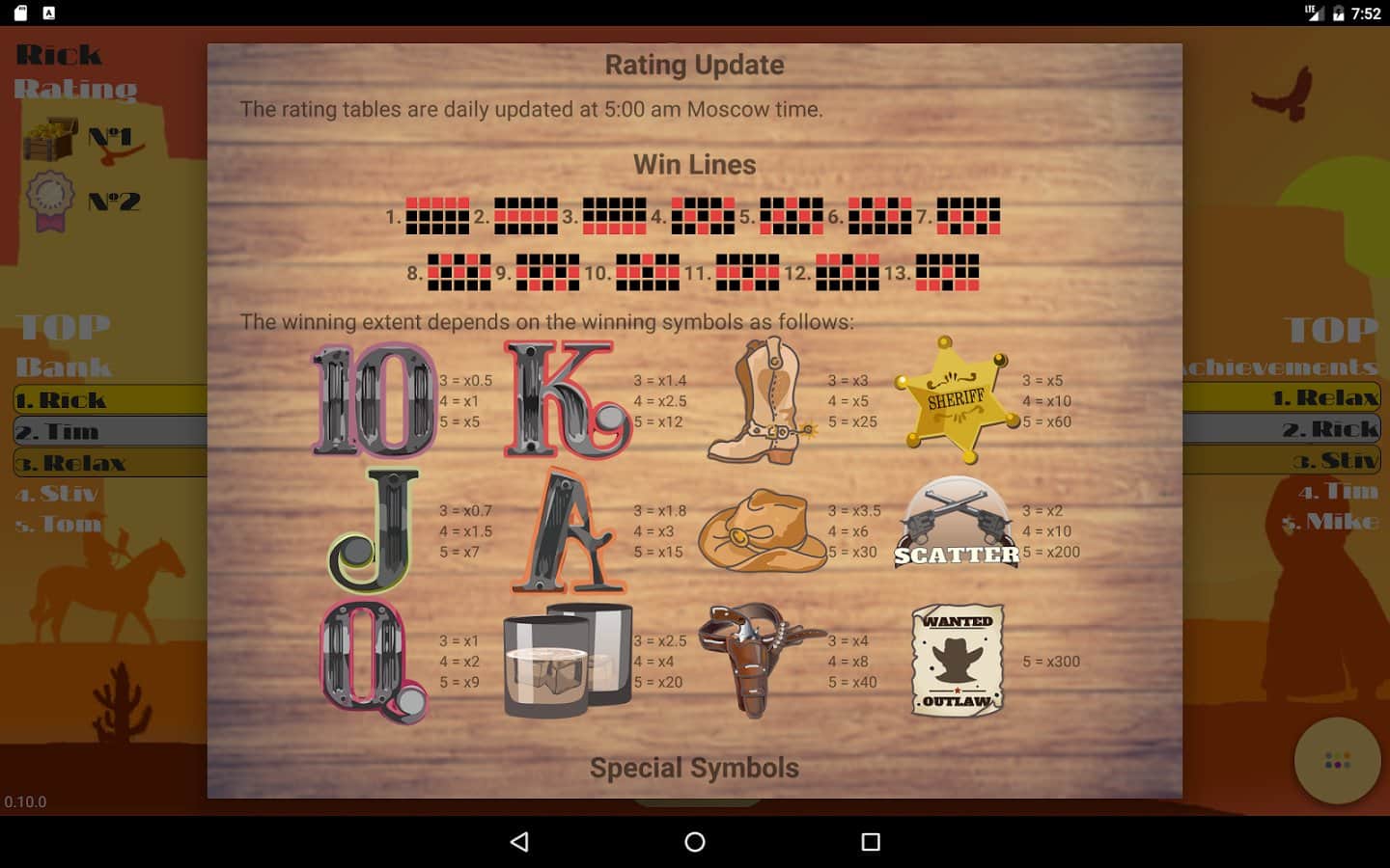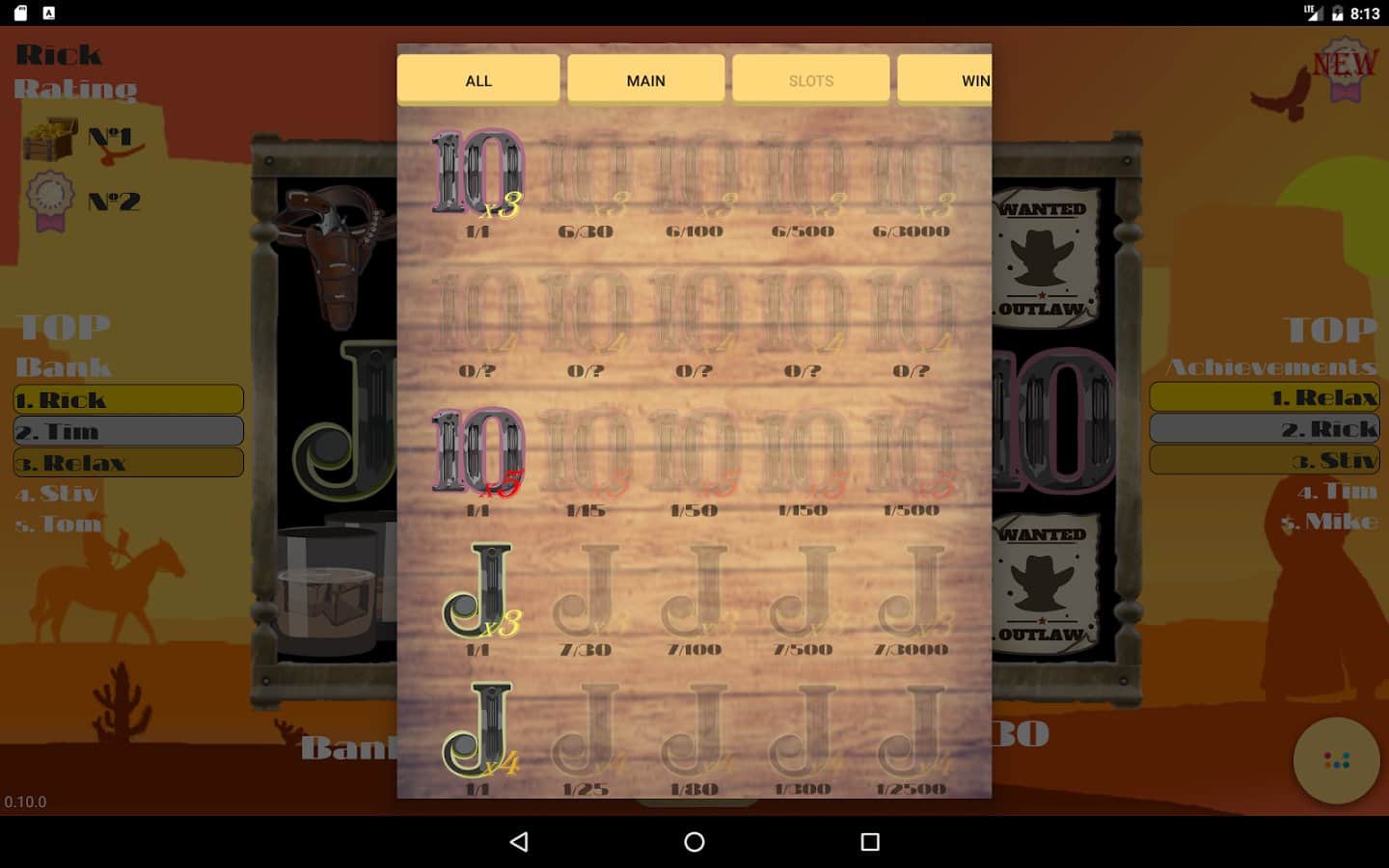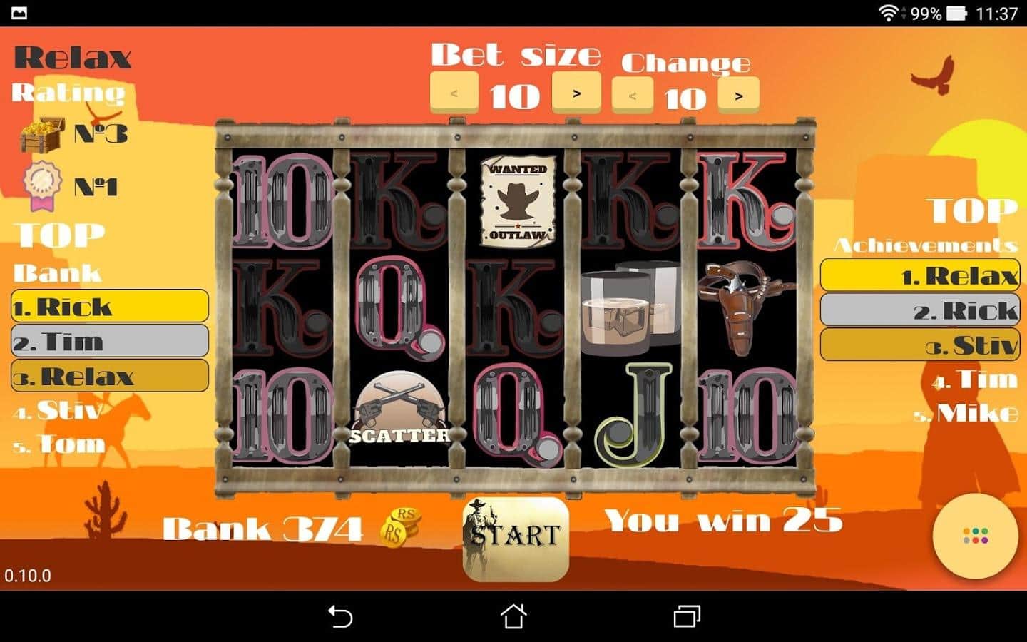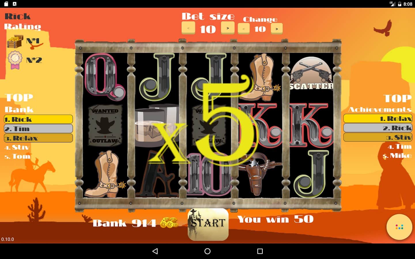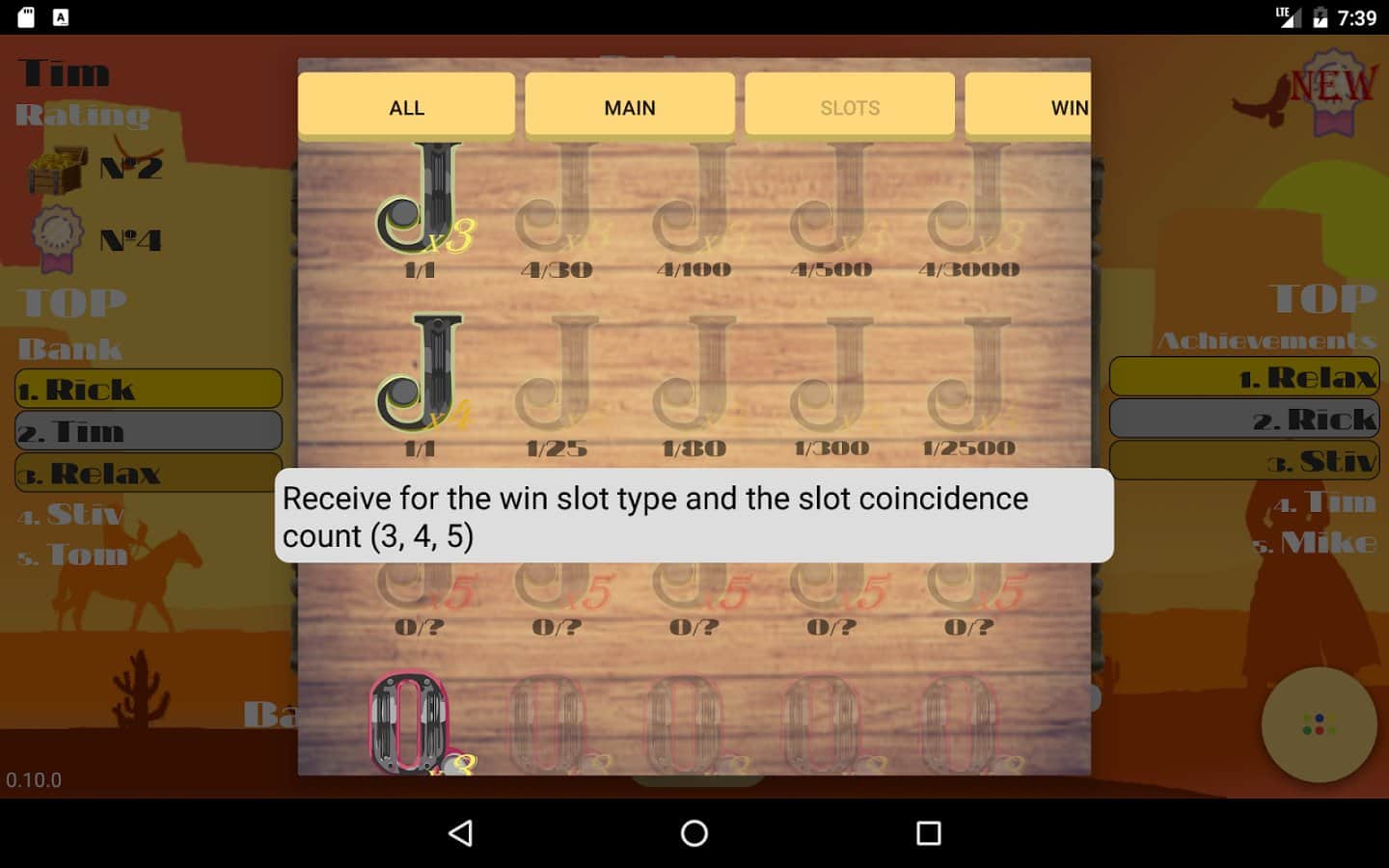 Değerlendirme Slotları – Android için bir slot makinesi, burada şansınızı gerçek anlamda test edebilirsiniz. Bu oyun, ana görevinizin maksimum miktarda madeni para ve başarı toplamak olduğu Vahşi Batı tarzında tasarlanmıştır. Bahislerinizi yapın ve slot makinesini çalıştırın, makaraların döndüğünü ve kazanç hatlarının oluştuğunu izleyin. Oyunda toplam 13 kazanç hattı bulunmaktadır, hepsini elde edin. Lider tablosunda daha üst sıralara çıkın ve burada liderlik pozisyonlarını alın, arkadaşlarınız ve dünya genelindeki diğer oyuncularla yarışın. Her gün sıralama tablosu güncellenecek, bu yüzden fırsatınızı kaçırmayın. Süper oyunu aktive edin ve tüm madeni paraları ve başarıları toplayın.