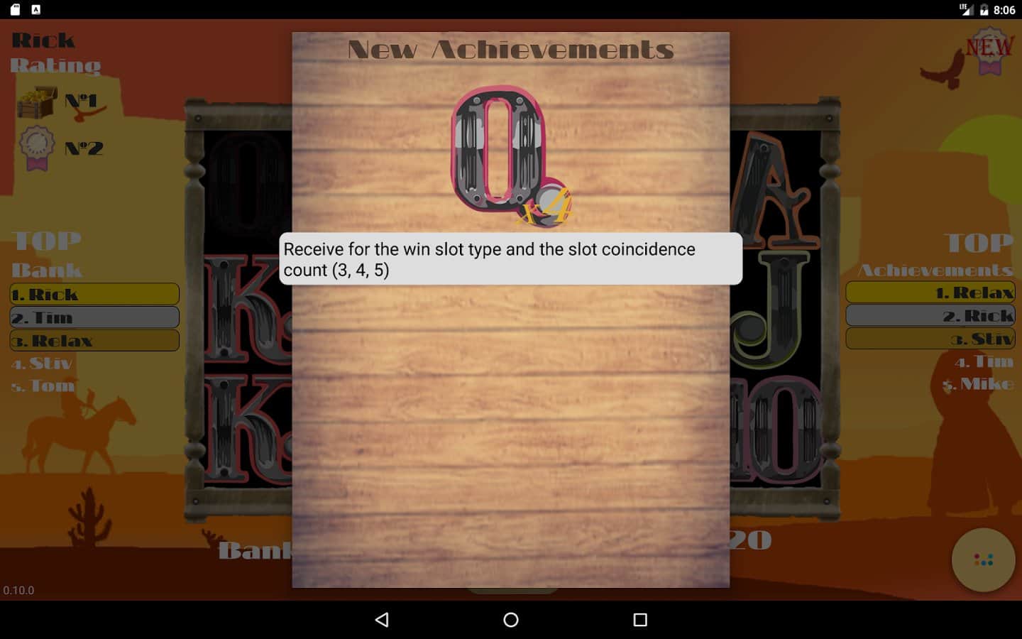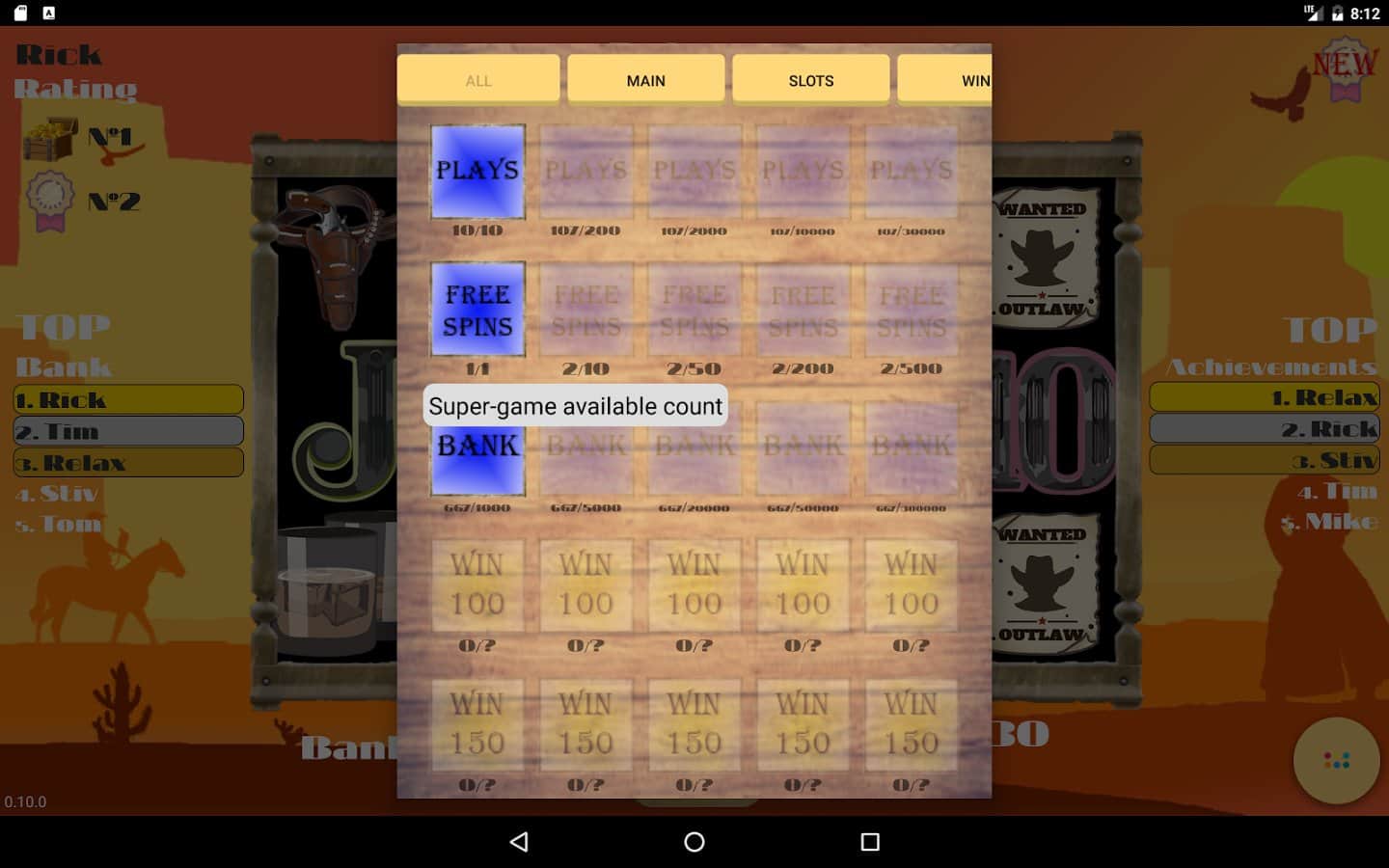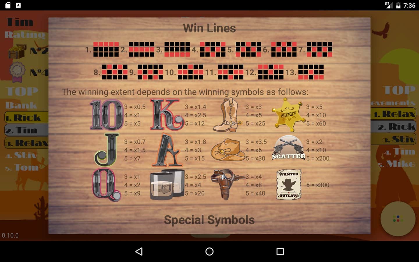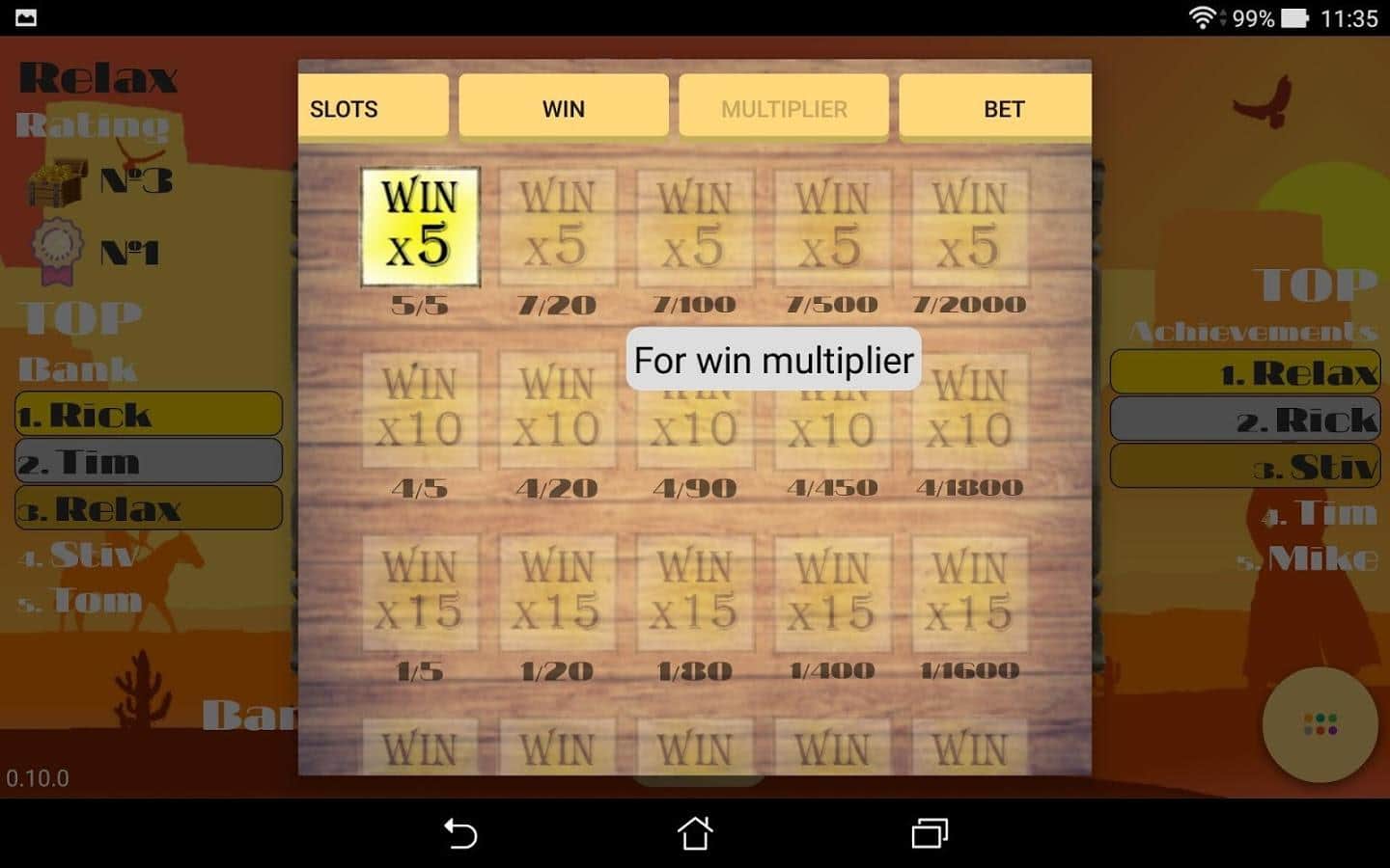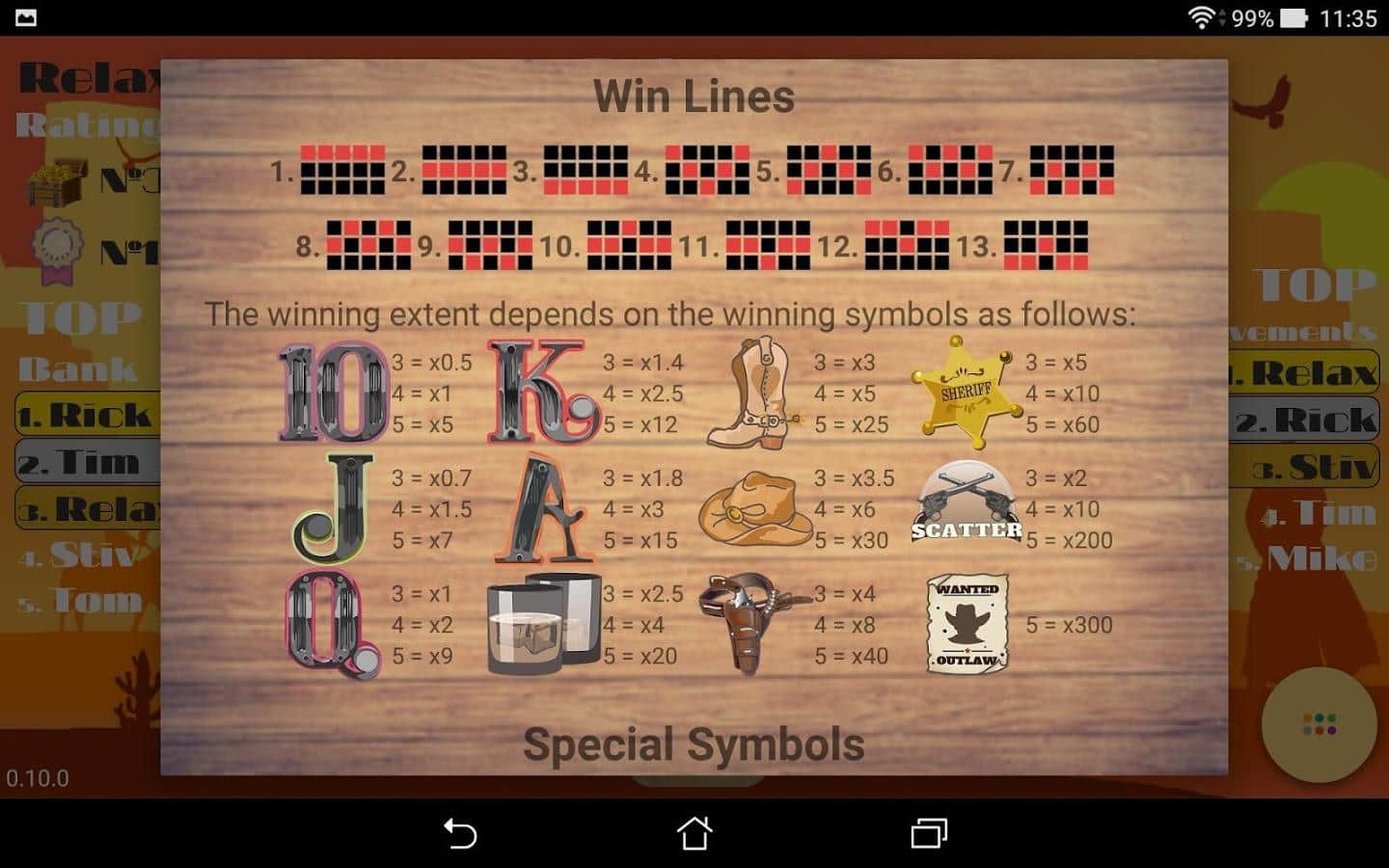 Değerlendirme Slotları – Android için bir slot makinesi, burada şansınızı gerçek anlamda test edebilirsiniz. Bu oyun, ana görevinizin maksimum miktarda madeni para ve başarı toplamak olduğu Vahşi Batı tarzında tasarlanmıştır. Bahislerinizi yapın ve slot makinesini çalıştırın, makaraların döndüğünü ve kazanç hatlarının oluştuğunu izleyin. Oyunda toplam 13 kazanç hattı bulunmaktadır, hepsini elde edin. Lider tablosunda daha üst sıralara çıkın ve burada liderlik pozisyonlarını alın, arkadaşlarınız ve dünya genelindeki diğer oyuncularla yarışın. Her gün sıralama tablosu güncellenecek, bu yüzden fırsatınızı kaçırmayın. Süper oyunu aktive edin ve tüm madeni paraları ve başarıları toplayın.