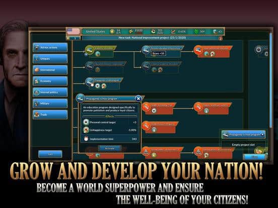 Realpolitiks Mobil – IOS için sıra tabanlı bir strateji oyunu, burada bir devletin başı rolünü üstleneceksiniz. Bu oyundaki ana göreviniz, devletinizi egemenliğe ve refaha ulaştırmaktır. Diplomasi ile ilgilenin, siyasi ve ekonomik sorunları çözün, ayrıca diğer ülkeler hakkında gerekli bilgileri öğrenmek için casusluktan faydalanın. Ordu ve ekonominizi geliştirin, hangi ülkelerle ittifak kuracağınıza ve hangi ülkelerle savaşa gireceğinize karar verin. Nükleer silahlar geliştirin ve diğer devletlere tehditler savurarak dünyada etki elde edin. Gerçek bir politikacı olun ve inanılmaz sonuçlar elde edin.