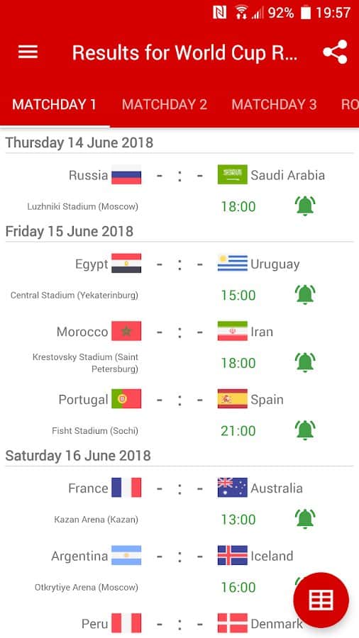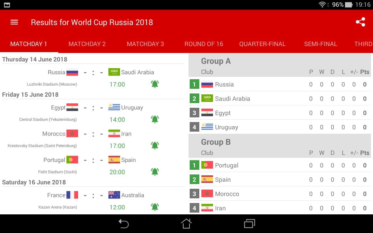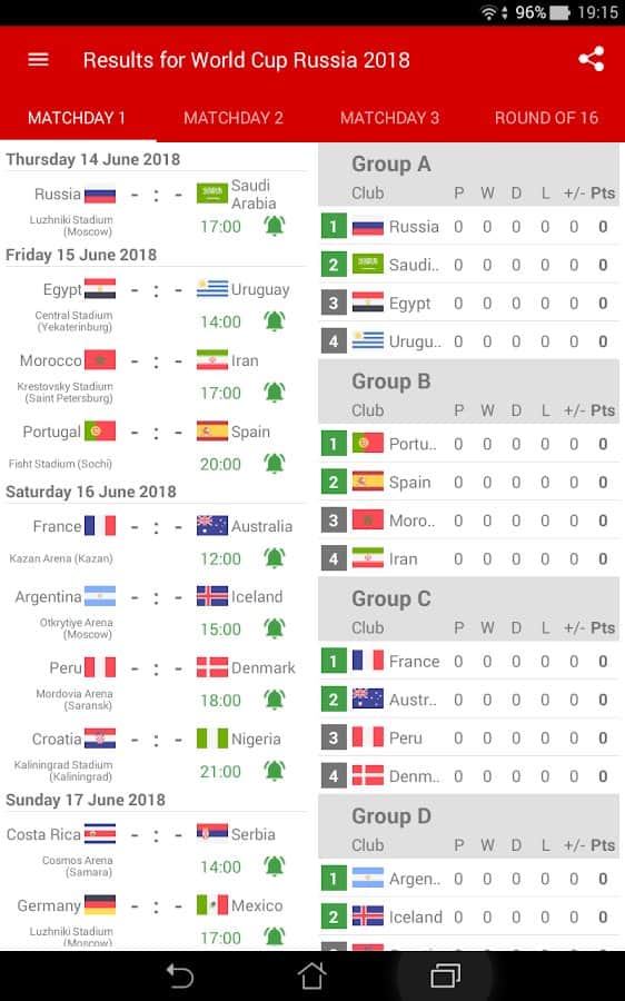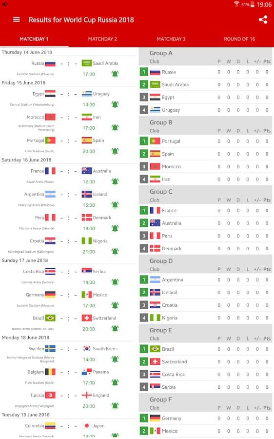 2018 FIFA Dünya Kupası Sonuçları - bu uygulama, 2018 Rusya Dünya Kupası sırasında maç sonuçlarını ve grup tablolarını takip etmenize yardımcı olacak bir uygulamadır. Uygulama takvim, programlar, grup tabloları içerir ve gerçek zamanlı olarak sonuçları ve istatistikleri gösterir. Uygulama ayrıca atılan goller, maçın başlangıcı ve bitişi hakkında push bildirimleri gönderecektir. Kullanışlı ve basit bir uygulama indirin ve 2018 FIFA Dünya Kupası'ndan hızlı sonuçları gerçek zamanlı olarak alın.