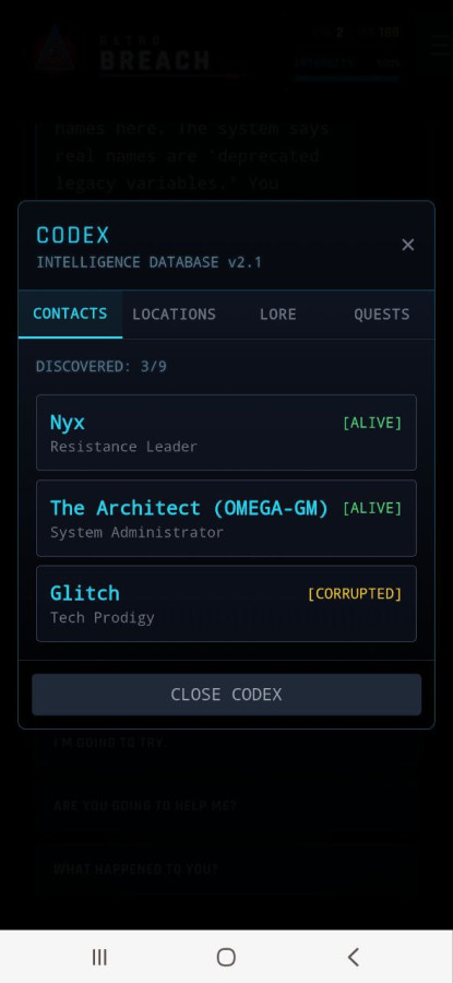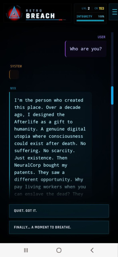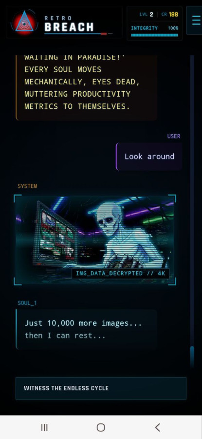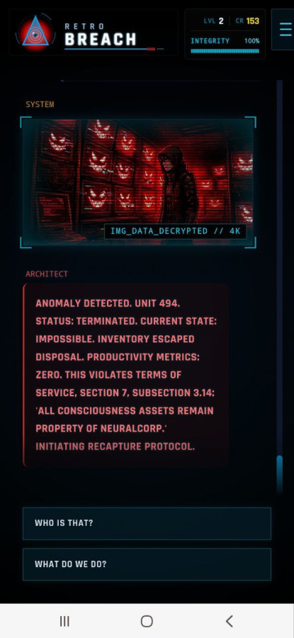 Retro Breach — karanlık bir etkileşimli dramadır; burada ölümden sonra gizli bir ağın içinde uyanıyorsunuz ve zihninizin bir şirketin iş gücüne dönüştüğünü öğreniyorsunuz. Sizi hacker testleri, sonuçları olan seçimler ve gerçeği yeniden kazanma mücadelesi bekliyor. Sistemi manipüle edin, dijital bekçilerden kaçının ve hapishane sunucusunu yok edebilecek bir virüsü etkinleştirerek gerçek özgürlük şansı elde edin.