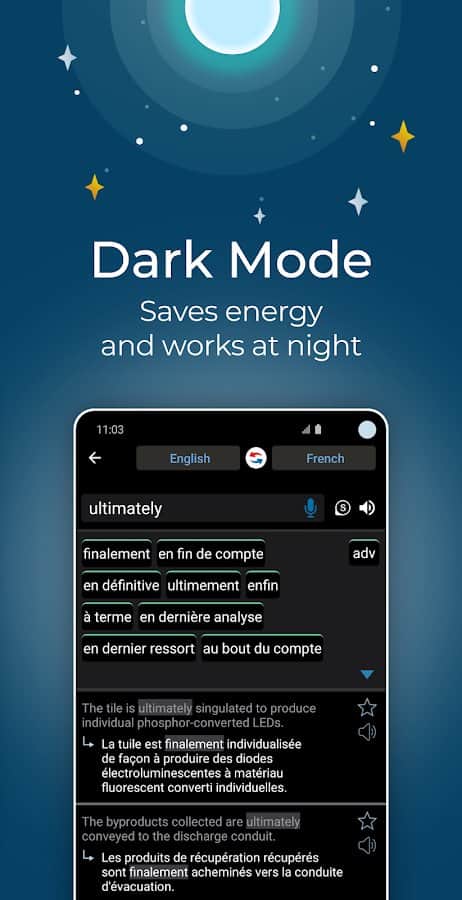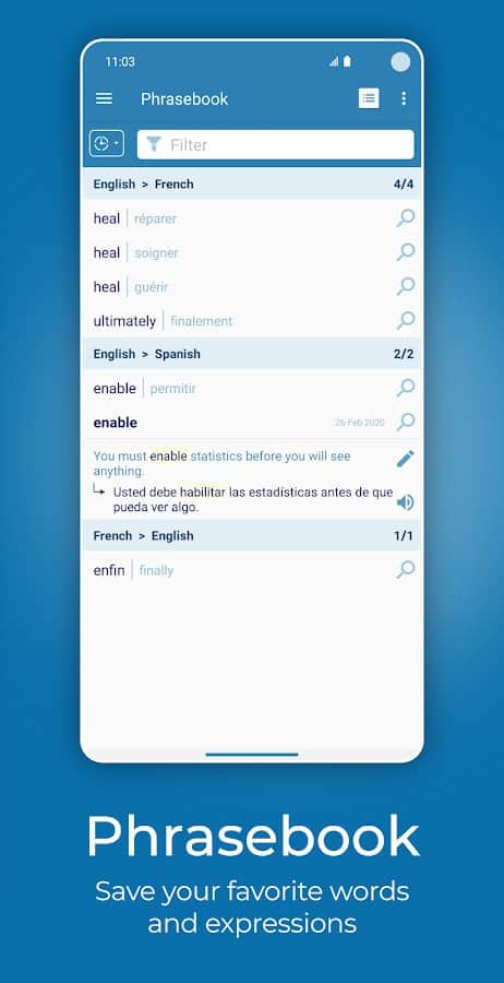 Reverso Çeviri Sözlüğü - Sadece birçok kelime içeren değil, aynı zamanda gerçek metinlerden örnekler sunan eşsiz bir çevirmen, bu da karmaşık kelime gruplarını ve tüm metinleri çevirme olanağı sağlar, bu sırada edebi anlamı kaybetmeden. Hem normal bir çevirmen olarak hem de dil öğrenme kursu olarak mükemmel bir şekilde uygundur. Basit ve oldukça güçlü bir arama sistemi, herhangi bir metni zahmetsizce çevirmenizi sağlar ve belirli kelimelerin kullanım örneklerini sunar. Bunun yanı sıra, kendi kelime listelerinizi örnekleriyle birlikte kullanabileceksiniz.