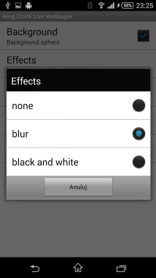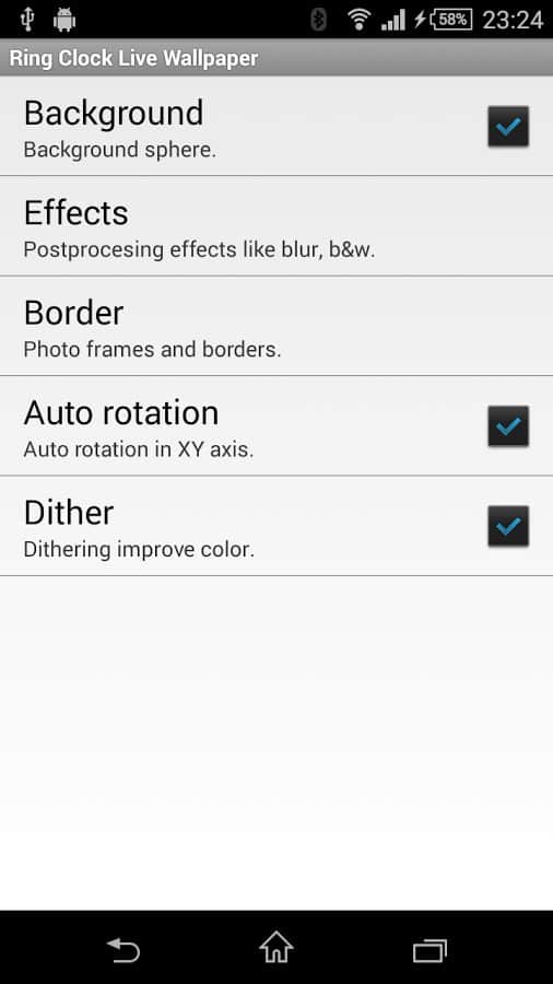 Yüzük Saati – Android için canlı duvar kağıtları, oldukça yüksek bir seviyede yapılmış ve güzellik ile işlevselliği birleştiren. Birçok canlı duvar kağıdı yalnızca bir işlevle sınırlıdır – bu da grafik arayüzün değiştirilmesi, bu da sahibini yeni renkler ve tasarımlarla mutlu edebilir. Ancak bu canlı duvar kağıtları, tüm güzelliklerinin yanı sıra, zamanı, bugünkü tarihi gösterebilir ve ayrıca mobil cihazınızın ne kadar şarjı kaldığını görsel olarak gösterir. Duvar kağıtları birkaç efekti barındırır: bulanıklık, gri tonlamalar, sepya veya gürültü. Bu yüzden uygulamayı gönül rahatlığıyla yükleyin ve kullanımından keyif alın.