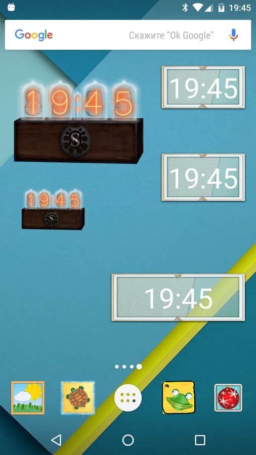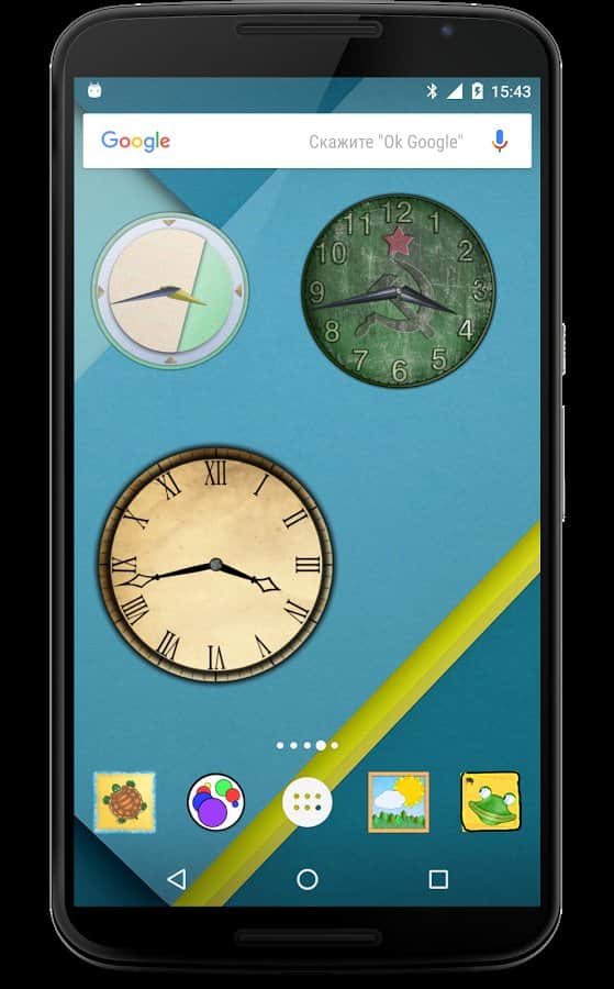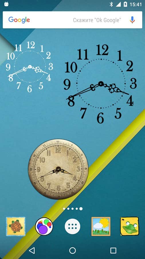 Ringing Clock uygulaması, kullanıcıya çeşitli tasarımlara sahip birkaç widget sunan bir saat uygulamasıdır ve eski tarzda stilize edilmiş bildirim seslerini (zil veya kukla) içermektedir.