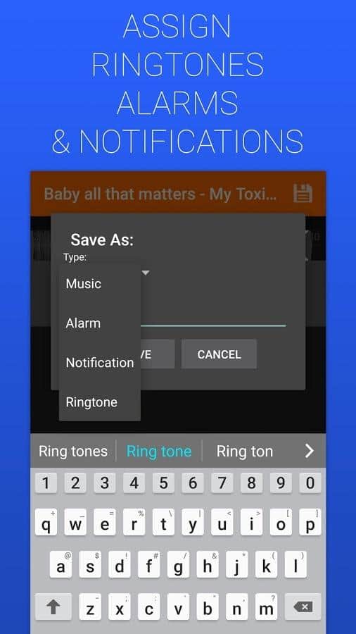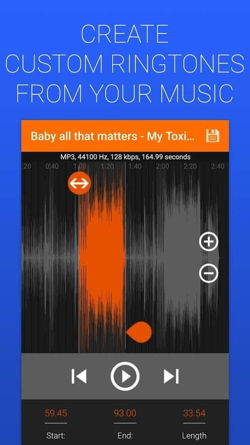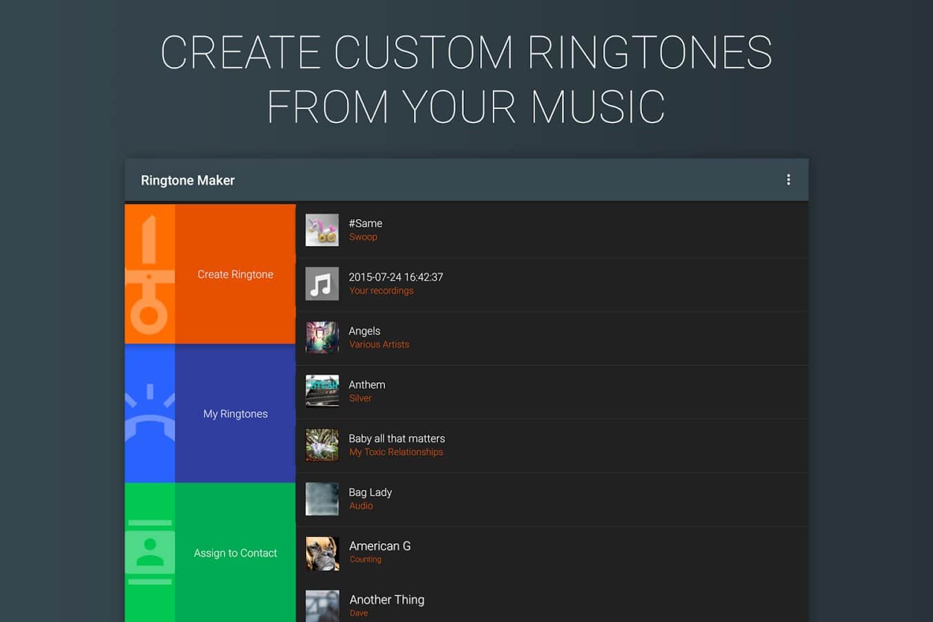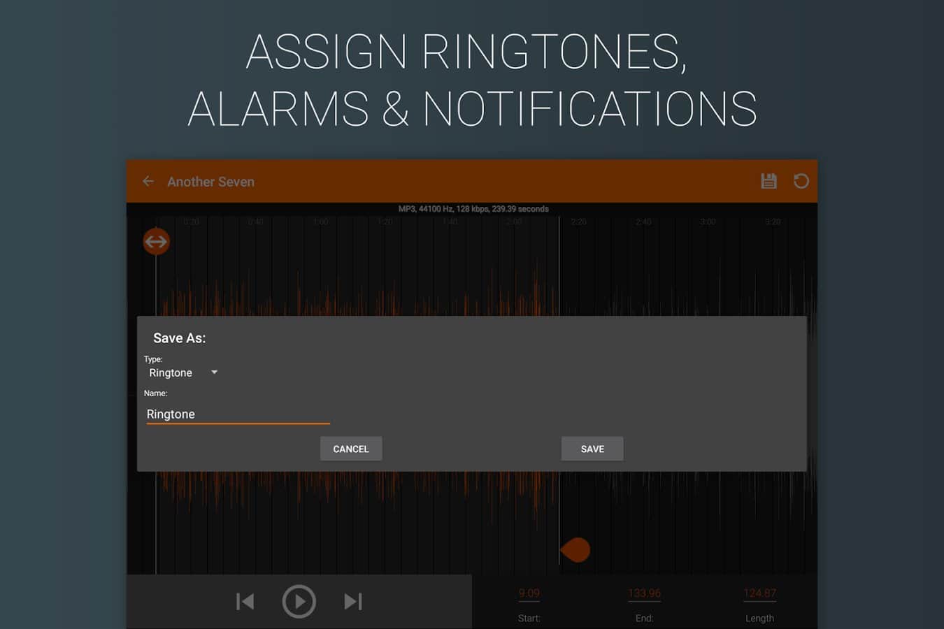 Ringtone Maker sayesinde müzik kaydedebilir, ardından düzenlemek için kendi müzik kütüphanenizden bir şey seçebilir ve zil sesi için bir kesit kesebilirsiniz. Kesiti işaretlemek için özel kaydırıcıları kullanabilir veya kesitin başlangıç ve bitiş zamanını tam olarak belirtebilirsiniz. Oluşturulan dosyalar sadece aramalar için değil, diğer bildirimler, alarm vb. için de kullanılabilir.