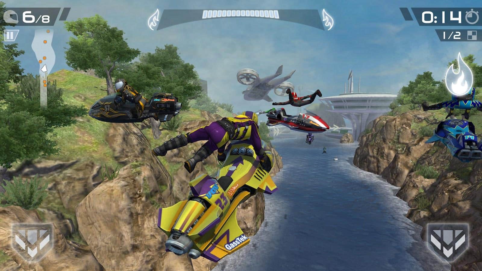 Riptide GP2 – yoğun çok oyunculu Android yarışları çevrimiçi! Geleceğin su parkurlarında jet motoruyla donatılmış bir hidro kaykayını yönetmeniz gerekecek. Oyun, taşıtlarınızın modifikasyonunu ve hareket motorunun geliştirilmesini içeriyor.