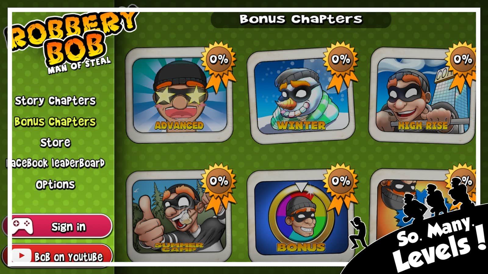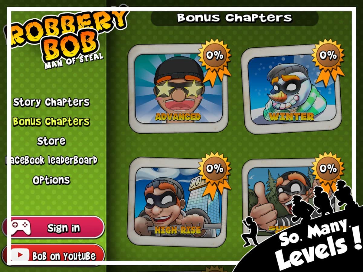 Robbery Bob - hırsız, pek şanssız, yavaş ama emin adımlarla karanlık işini yapıyor; yani evleri, daireleri ve ofisleri soymakla meşgul. Eline ne geçerse alıyor - para, altın, takılar, hatıralar, elektronik eşyalar ve hatta televizyonun kumandası bile! Cesareti de yadsınamaz - çünkü gündüz bile çalmaktan çekinmiyor. Tek bir sorunu var - sahipler, güvenlik ya da köpekler tarafından yakalanmamak! Bunun için gayret göstermesi gerekiyor - bazen beklemek, bazen saklanmak ve bazen de hızla kaçmak gerekiyor; iyi ki oyun bu tür durumlar için de seçenekler sunuyor!