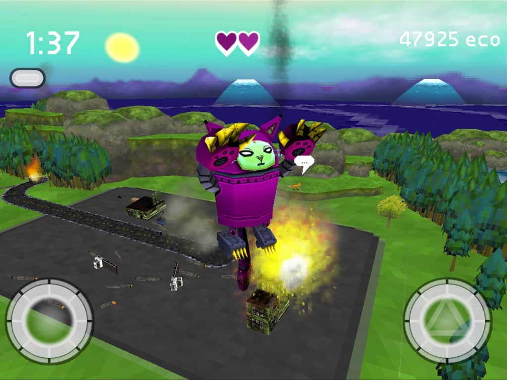 Robocat Rampage - android için bir oyundur ve siz uzaydan dev bir robot kediyi pilotluyorsunuz. Göreviniz, Dünya gezegenindeki doğayı ilk haline korumaktır. Puan kazanmak için şehirleri yok edin. Doğayı yok etmek negatif puan kazandırır. İnsanlar gezegeni kirletti ve onu şehirlerden ve yapılarından temizlemeniz gerekiyor. Silahlı bir insan isyanını bastırmak ve insanlığın ana silahıyla savaşmak zorundasınız.