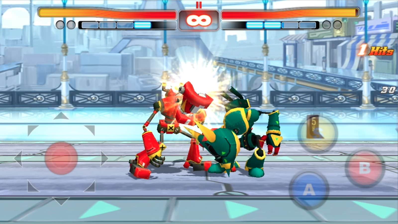 Oyundaki kontrol basit. Sanal joystick ve butonlar, vuruşlar ve bloklar için, aynı zamanda dönüşler için kullanılıyor. Robot savaşlarında gücünüzü ve zekanızı deneyin!
