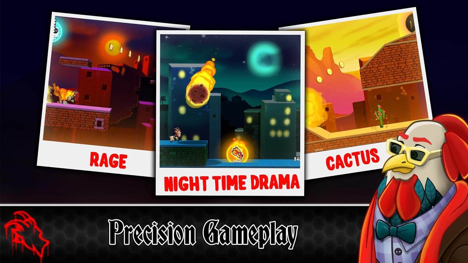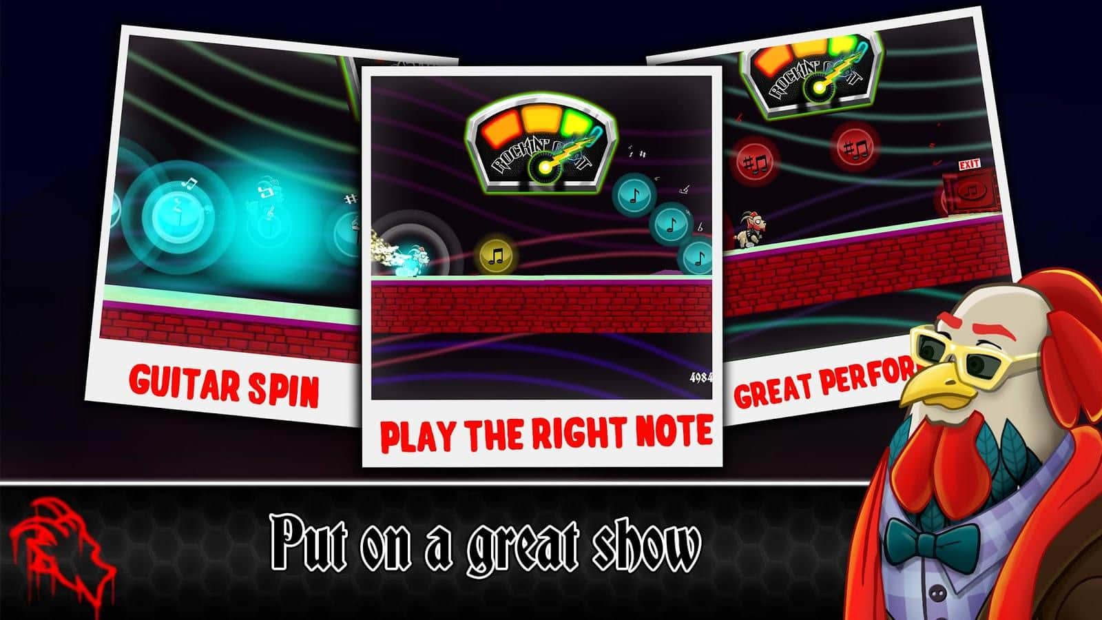 Rockin Goat, Android için yatay bir koşucu olup, platformer unsurları içermektedir. Oyun, türünün en iyi geleneklerinde gerçekleştirilmiştir; dinamik bir oyun deneyimi, sürükleyici bir hikaye, iyi grafikler, birçok bonus, ödül, başarı ve eşya ile basit bir kontrol sistemi sunmaktadır. Özellikle, ağır müzik hayranlarını kayıtsız bırakmayacak ses desteği dikkat çekmektedir.