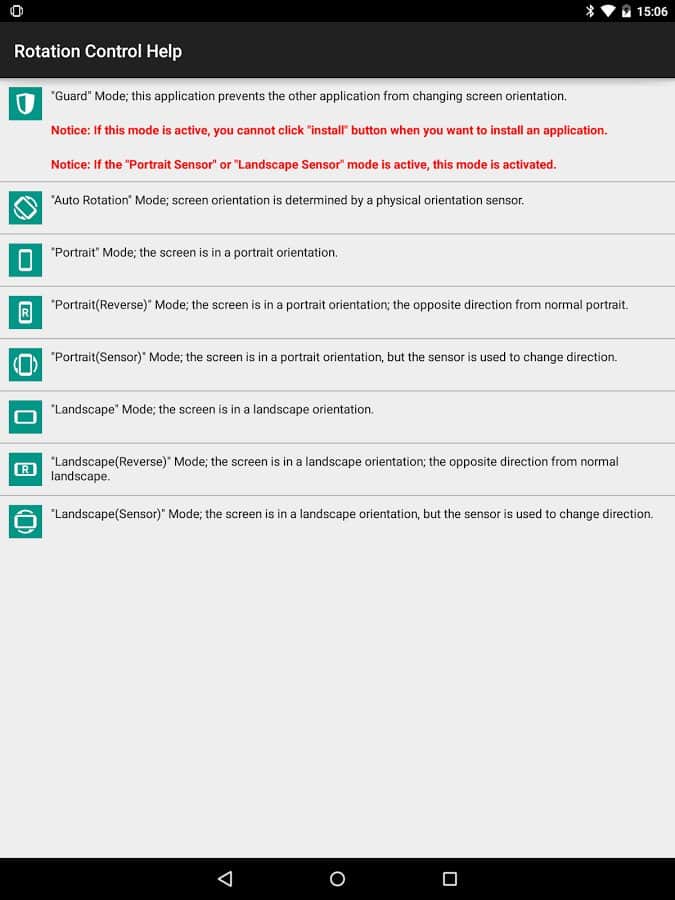 Dönme Kontrolü - Akselerometre ile sorunlar mı yaşıyorsunuz ve cihazınız ekranı döndüremiyor. Bu artık bir sorun değil, bu uygulama bunu kolayca çözebilir. Ekran döndürme sorunları olanlar için tasarlandı, burada her şeyi manuel olarak ayarlayabilir, otomatik döndürmenin nasıl çalıştığını kontrol edebilir veya sadece manuel olarak döndürebilirsiniz. Gereksiz işlevler yok, sadece döndürme. Ama bu uygulama yalnız değil, birden fazla mod içeriyor, bunların farklarını bu basit ama oldukça işlevsel uygulamayı cihazınıza kurarak kendiniz öğrenebilirsiniz.