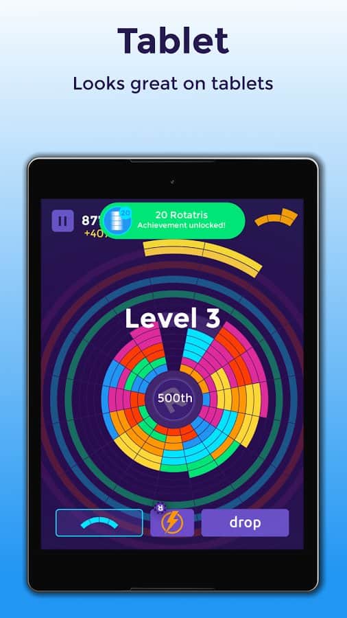 Rotatris – Blok bulmaca oyunu. – herkes tarafından bilinen tetris benzeri, android için yapılmış eğlenceli bir oyun. Bu oyundaki ana göreviniz, düşen blokları dönen bir daireye yerleştirerek, onların düşmesini ve halkaları kapatmasını sağlamak, böylece mümkün olduğunca fazla puan kazanmaktır. Tepkilerinizi gerçek hayatta test edin ve bu oyunda kendi rekorunuzu belirleyin. Daireyi kendi ekseni etrafında döndürün ve düşen şekil için uygun yeri arayın. Bloklardan mümkün olduğunca fazla halkayı kapatmaya çalışın ve liderler tablosunda en üst sıraya çıkın. En iyi sonuçlar için arkadaşlarınızla yarışın.