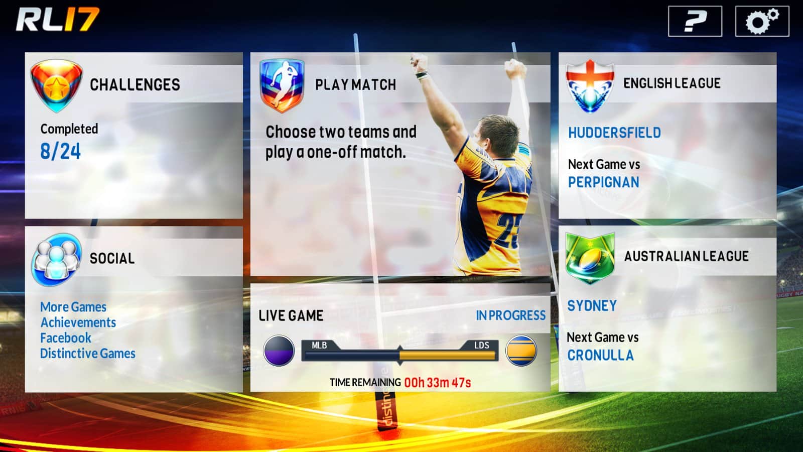 Rugby League 17 – Android'de oynanan bir spor oyunudur, burada rugby şampiyonasına katılacaksınız. Oyuncuların takımını kontrol altına alın ve İngiliz veya Avustralya ligindeki maçlara katılın. Takımınızı sahada yönetin ve deneyimli rakiplerinizi yenmenize yardımcı olacak yenilmez bir strateji geliştirin. Takımınızı sahaya çıkarın ve mümkün olduğunca fazla gol atmaya çalışarak farklı paslar ve fake'ler uygulayın. Birbirini takip eden maçları kazanarak turnuva tablosunda daha da yükseğe çıkın. Dünyanın dört bir yanındaki takımlarla oynayın ve tüm yeteneklerinizi ve becerilerinizi gösterin.