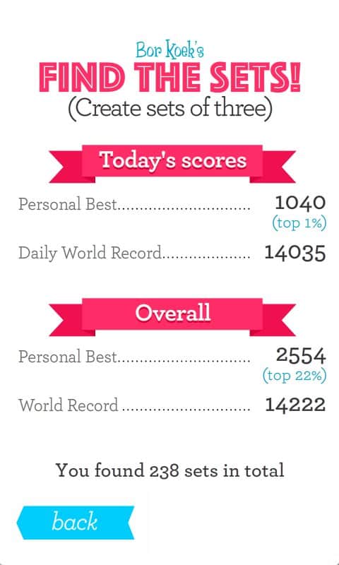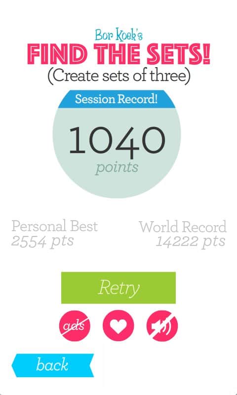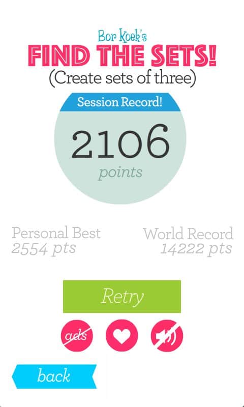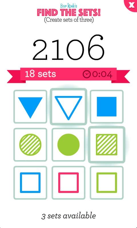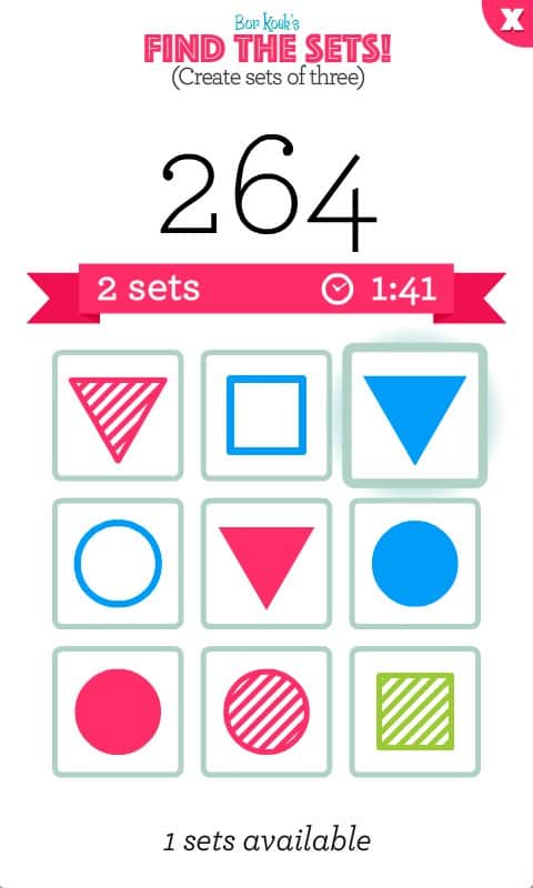 Set Set! Set!! – Android için bir bulmaca oyunu, bu oyunda beyninizi çalıştıracak ve boş zamanınızı eğlenceli bir şekilde geçireceksiniz. Bu oyundaki ana amacınız, geometrik şekilleri bir araya getirerek onların ya şekil, ya renk ya da dokuda aynı olmasını sağlamaktır. Mümkün olduğunca çok eşleşme yapmayı deneyin ve maksimum puanı kazanın. Beyninizi, tepkilerinizi ve düşünme hızınızı geliştirin ve arkadaşlarınızla en iyi sonuçlar için yarışın. Başarılarınızı Twitter'da paylaşın ve bu oyunda kendi rekorunuzu kırın. Oynayın ve boş zamanınızı faydalı bir şekilde değerlendirin.