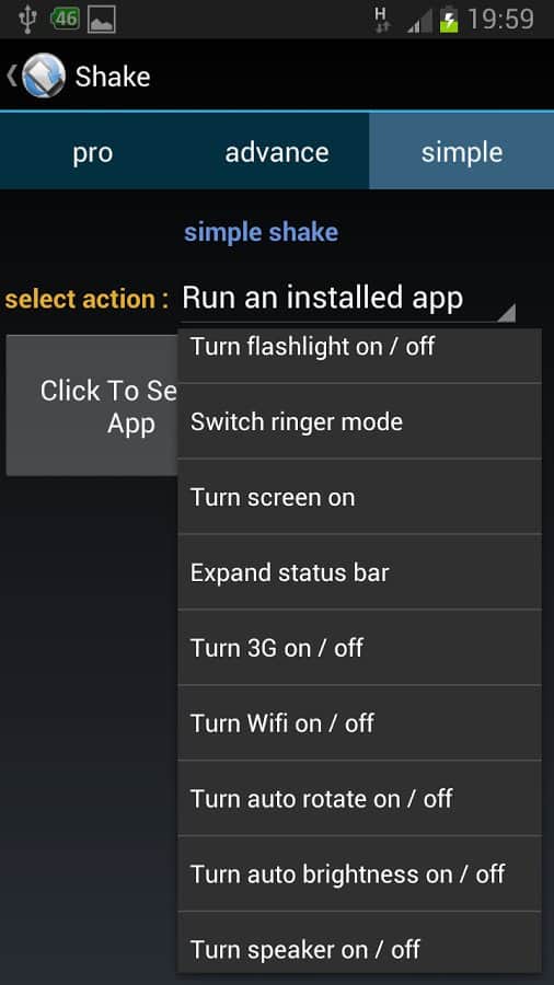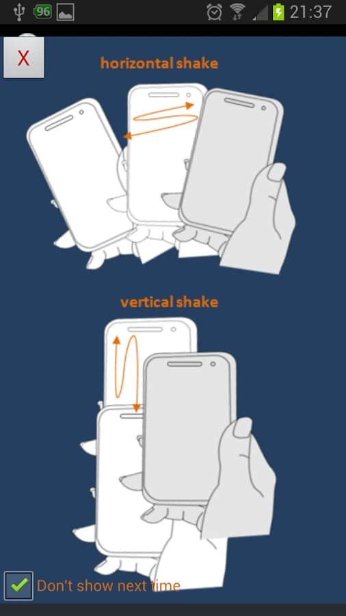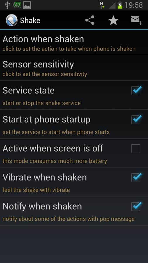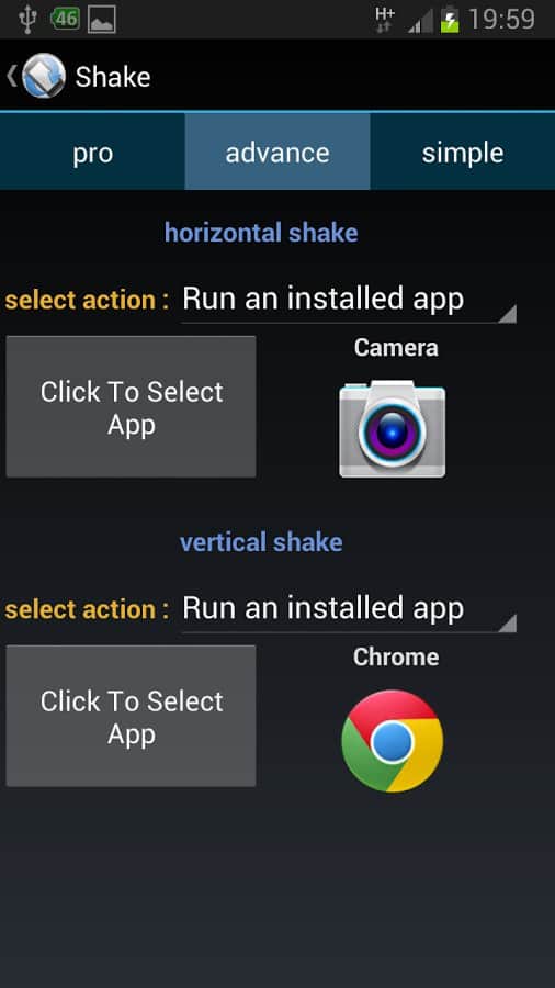 Bu uygulama tembel veya çok meşgul insanlara hitap edecek, çünkü basit bir sallama ile gerekli uygulamaları başlatmanıza izin veriyor, ayrıca akıllı telefonun ekranının açık olması da gerekmiyor. Sallama hareketleri iki türde olabilir: yatay veya dikey, uygulamada sallama gücünü kalibre edebilirsiniz, ve isterseniz akıllı telefon ayrıca bir titreşim ile 'karşılık verecektir'.