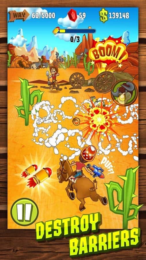 Ateş Et ve Kaç: Vahşi Batı - Vahşi Batı ortamında gerçekleşen bir macera aksiyon koşucusu. Tahmin edebileceğiniz gibi, cesur bir kovboy olarak oynayacaksınız, bozkırların fatihi. Ana oyun mekaniği klasik tarzda tasarlanmıştır, atınıza atlayın, baş döndürücü zıplamalar yapın, akıl almaz kaymalar gerçekleştirin, engellerden kaçının, ödüller ve paralar toplayın. Elbette aksiyon unsurları da ihmal edilmemiştir, düşmanları, özellikle de dev patronları yok edin, suçlularla savaşın. Oyun ilerledikçe karakterinizi önemli ölçüde geliştirme fırsatına sahip olacaksınız; bu yalnızca yeteneklerle değil, aynı zamanda ekipmanla da ilgilidir. Ayrıca mükemmel çizim grafiği, rahatsız etmeyen bir müzik, basit kontroller ve birçok oyun imkanı dikkat çekiyor.