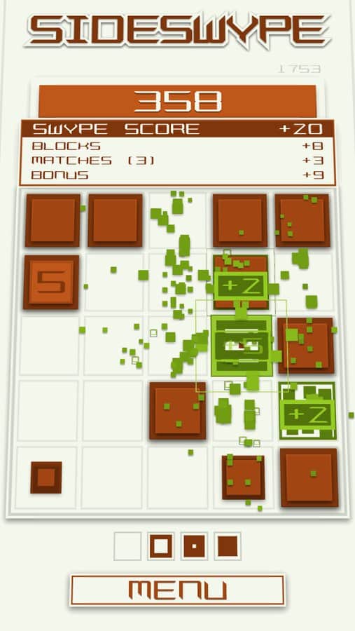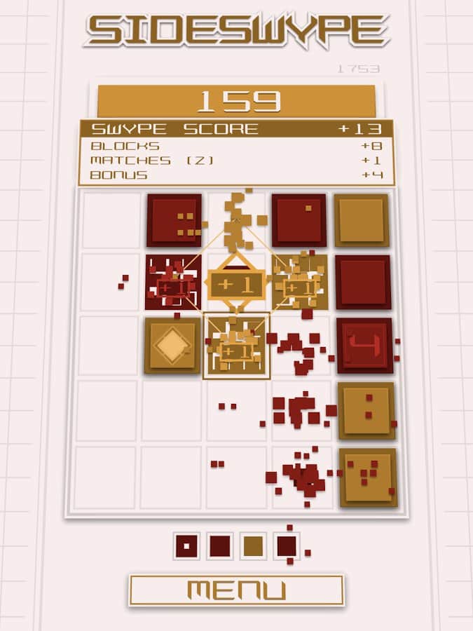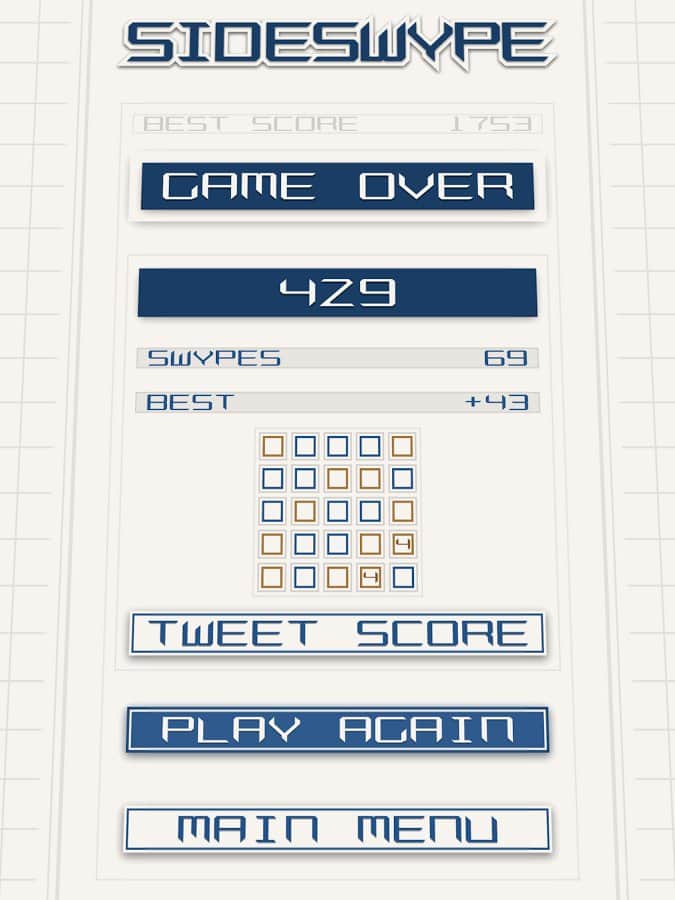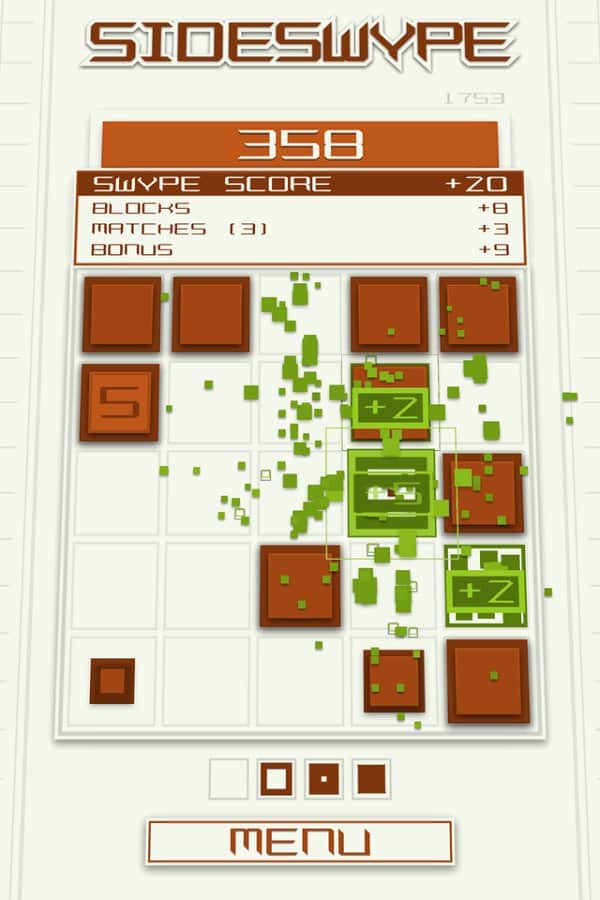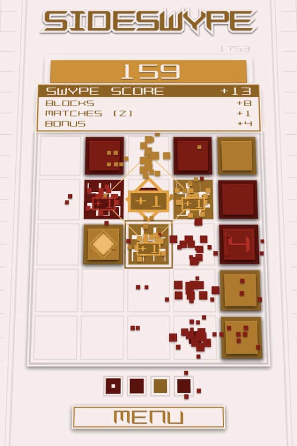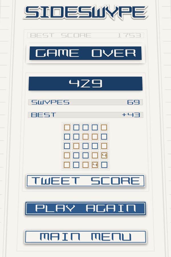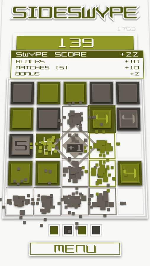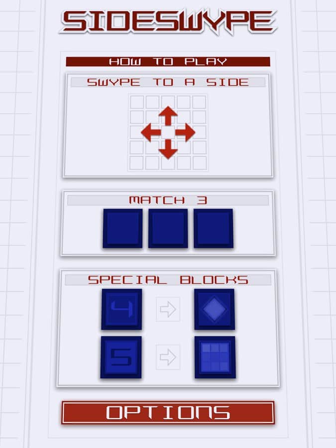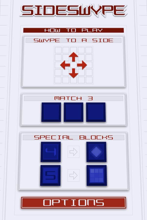 SideSwype - Slydris'in yaratıcılarından güzel ve minimalist bir bulmaca oyunu. Ekranda parmağınızı kaydırarak blokları 4 yönden birine serbestçe kaydırın. 3'ten fazla bloğu birleştirerek yok edin. 3'ten fazla blok toplarsanız, ek bonuslar kazanabilirsiniz. Oyundaki kontrol basittir ve uzun süre öğrenmenizi gerektirmez, ayrıca hoş meditatif müzik tamamen rahatlamanızı sağlar. Oyunda 10'dan fazla farklı başarı vardır, bunları mümkün olduğunca kazanmaya çalışın. 6 farklı renk şemasından birini ve 2 orijinal şarkıdan birini seçin.