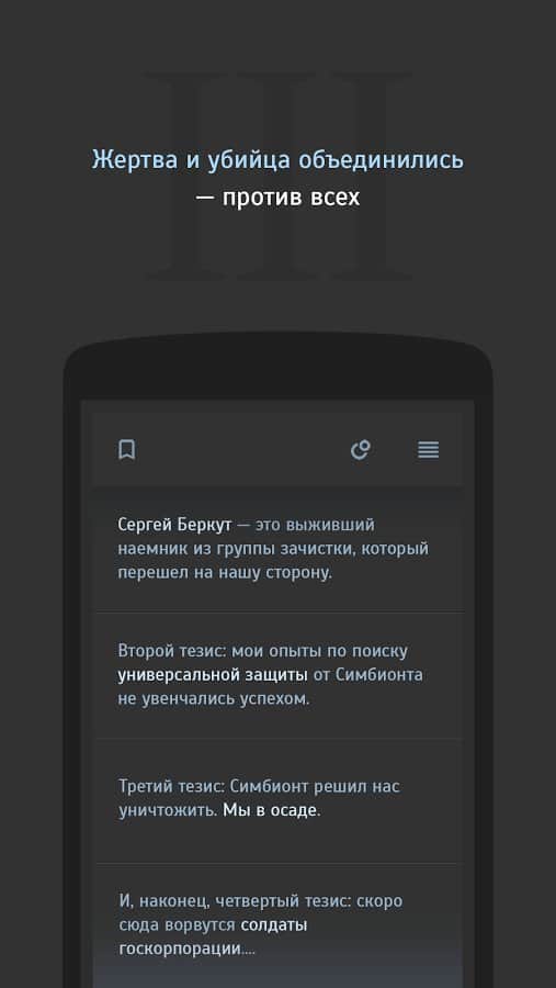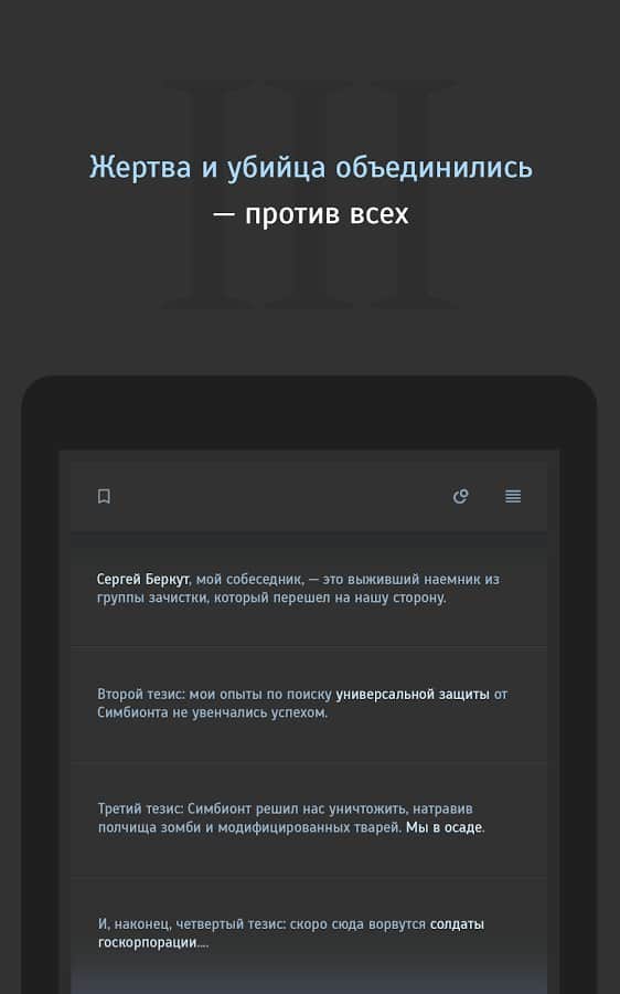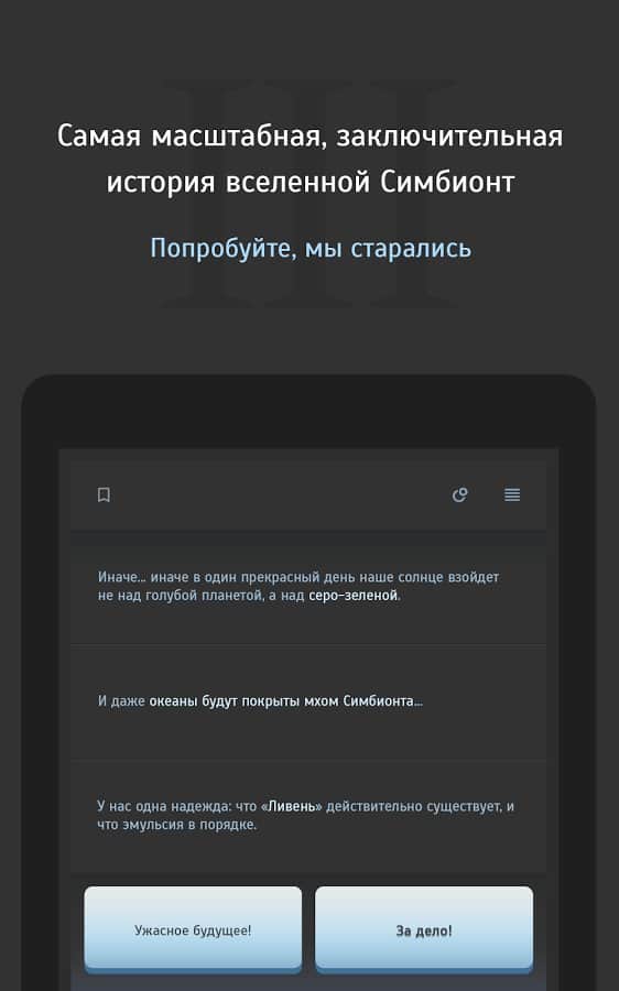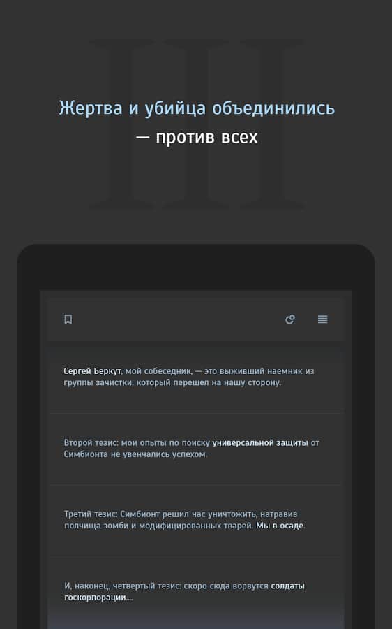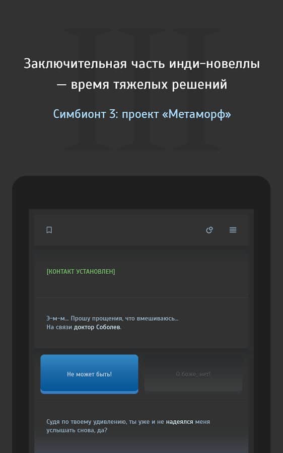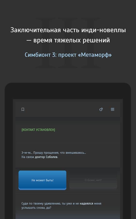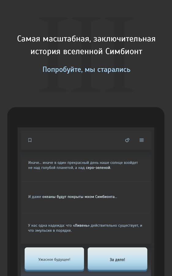 Simbiyont 3 - metin tabanlı stratejinin üçüncü bölümü, burada yeniden M-2 Sığınakları'na gitmeniz ve iki mevcut kahramandan biri olarak laboratuvarın ana sırlarını bulmanız gerekiyor. Toplamda üç farklı hikaye kampanyası, 2000'den fazla lokasyon, 60.000'den fazla mesaj ve oyunun beş farklı sonu sizi bekliyor. Simbiyont 3'ün oyun mekanikleri, klasik metin tabanlı rol yapma oyunları şemasına dayanıyor, sürecin etkileşimi, gerçekleşen olayların tüm gerçekliğini tam anlamıyla hissetmenizi sağlayacak ve tam Rusça desteği, oyunun keyifli izlenimini tamamlayacaktır.