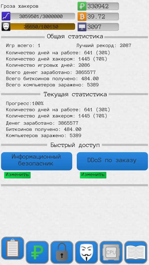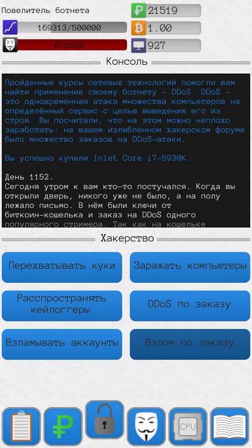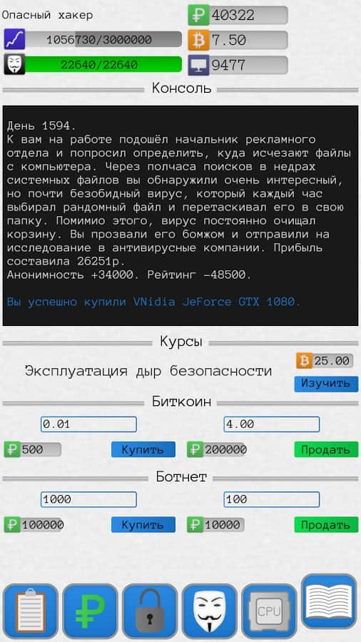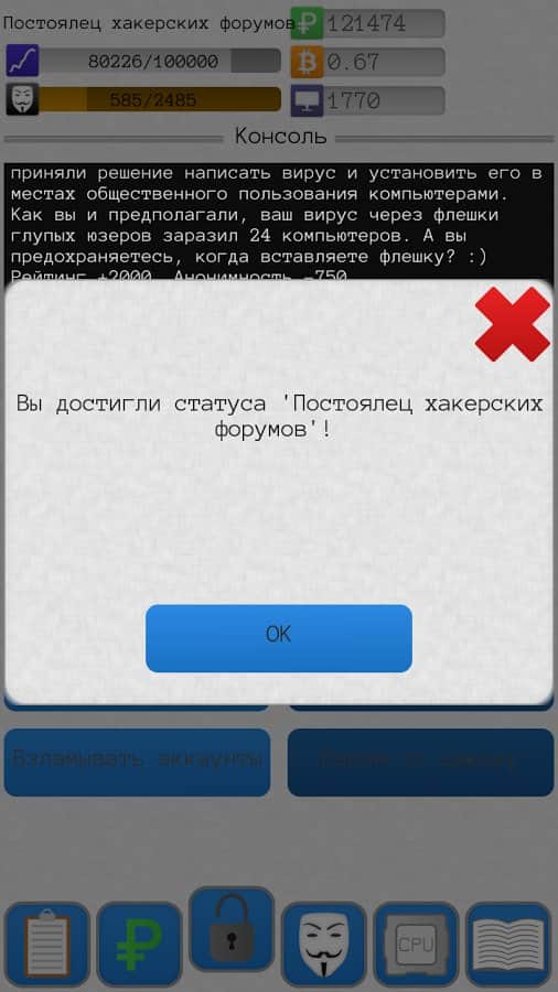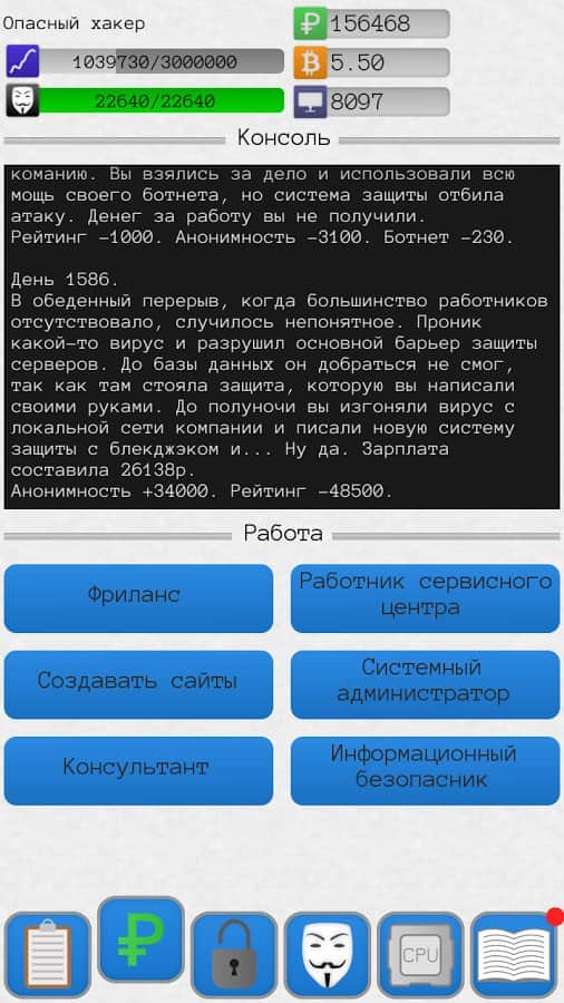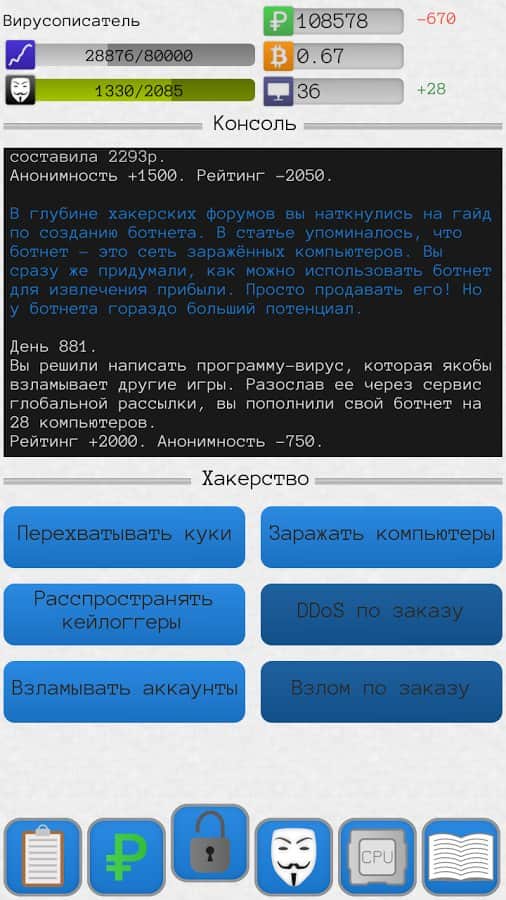 Hacker Simülatörü - Android için bir oyun, burada sıradan bir insandan bir hackere dönüşebilirsiniz. Bu oyunda, size hackerların inanılmaz dünyası açılacak ve en iyilerden biri olabileceksiniz, DDoS saldırıları gerçekleştirecek ve ödül olarak bitcoin alacaksınız. Farklı kursları tamamlayarak ve çeşitli görevleri yerine getirerek bu oyundaki sıralamanızı artırın. Sürekli olarak anonimliğinizi koruyun ve hackerlıkla ilgili tüm şüpheleri üzerinizden atın. Seçiminize sunulacak çeşitli metin durumlarını geçerek itibarınızı artırabilirsiniz. Dört gelişim dalını tamamlayın ve sıralamanızı yükseltin. Anonimlik seviyenizi düşürmemeye çalışın, aksi takdirde tespit edilirsiniz. Tüm hackerların korkusu olun ve bu oyunda inanılmaz sonuçlar elde edin.