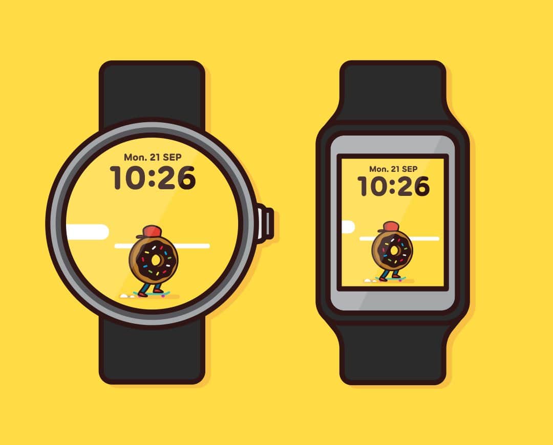 Donut kaykaycı bileğinizde — bu hem ses hem de görünüm olarak oldukça absürt. Ama bu saat yüzü hakkında hemen sonuçlar çıkarmaya acele etmeyin! Parlak sarı arka plan ve zıt kalın yazı fontu sayesinde ekrandaki metin kolayca okunabiliyor ve sayılara dikkat etmenize gerek kalmıyor, dolayısıyla saati öğrenmek için çok fazla zaman harcamanıza gerek yok. Önemli olan o neşeli donut'a bakakalmak değil, kendi işlerinin peşinde koşması.