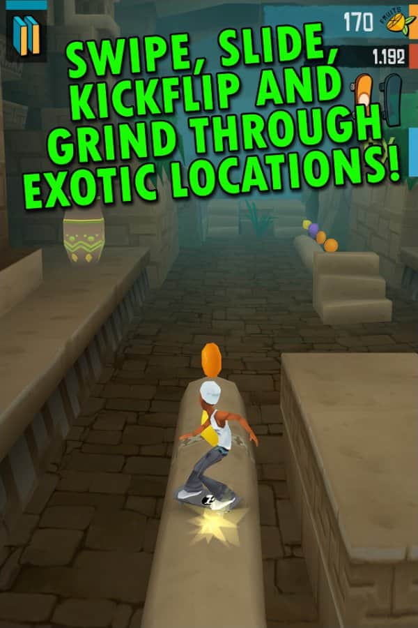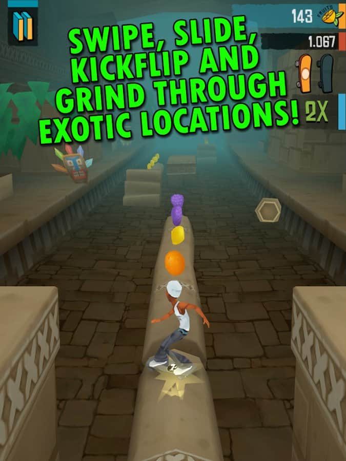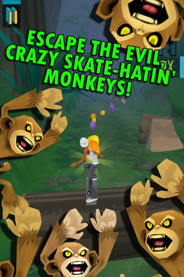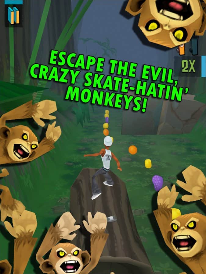 Kaykay Çılgınlığı - android için bir oyun, burada ormanda koşacak, zıplayacak ve kayacaksınız. Yerlilerden ve maymunlardan kaçarken yol boyunca yeni yetenekleri açmak ve kahramanınızı geliştirmek için bonus meyveler toplayın.