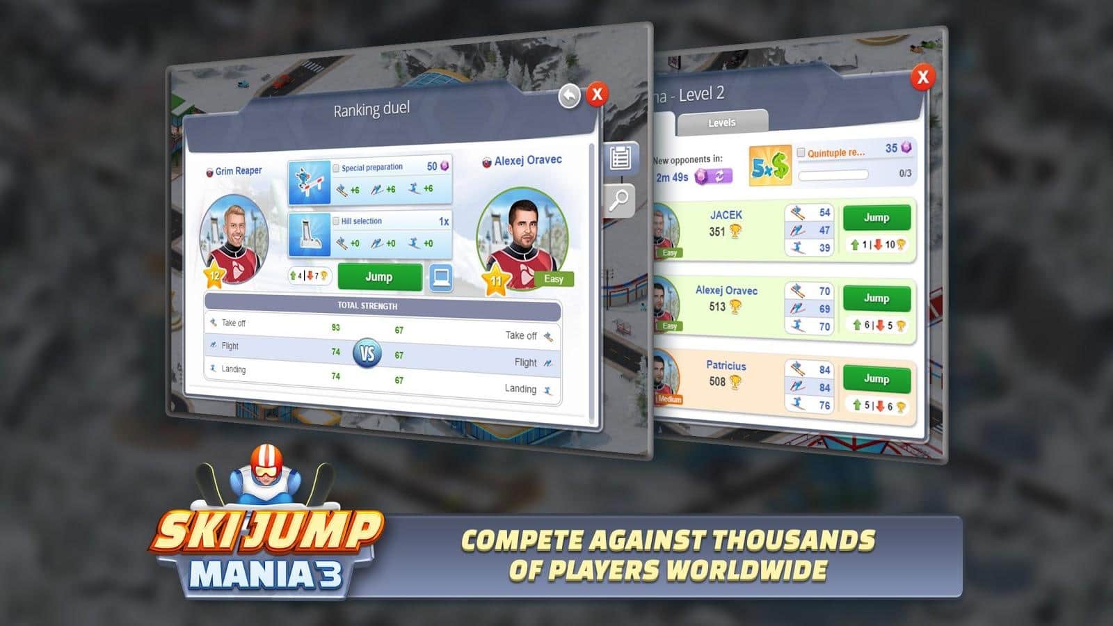 Kayak Atlama Mania 3 – Android için bir spor oyunu, burada rampadan atlayan bir kayakçı rolünü üstleneceksiniz. Dünyanın farklı köşelerinde düzenlenen çeşitli şampiyonalara katılın ve en iyi sonuçları göstererek liderlik pozisyonlarını elde edin. Kış sporlarındaki kariyerinizi inşa edin ve kayakla atlama dünya şampiyonu olun. Farklı rampalardan inmeye hazırlanın ve sporcunuzu düşmekten koruyun. Yarışmalardaki zaferleriniz için ödüller ve madalyalar kazanın ve modern ve kaliteli ekipman ile kayaklar edinin.
