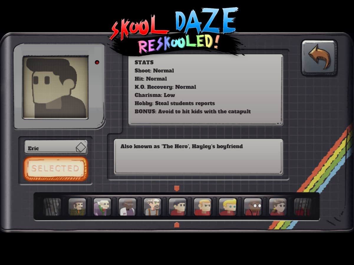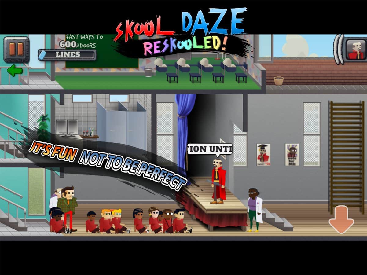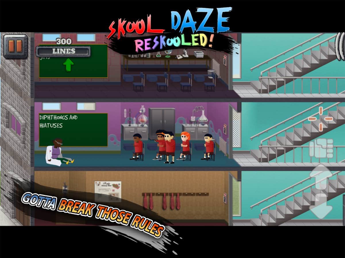 Skool Daze Reskooled! - ilk olarak 1985 yılında ZX Spectrum platformunda çıkan bir arcade oyunudur. Bu proje, zamanında kıskanılacak bir popülariteye sahipti ve 30 yıl sonra Skool Daze Reskooled! Android cihazlarda ortaya çıktı. Oyunun ana karakteri, Britanya okulunun bir öğrencisi olan Eric'tir. Hikayeye göre, karakterimiz örnek bir davranış sergilememektedir ve oyundaki ana hedef, öğretmenin çocuğun ebeveynlerine göstermek istediği Eric'in özelliğini çalmaktır. Kayıp belge, müdürün kasasında saklanmaktadır ve kasayı açmak için dört haneli bir kod kullanmak gerekmektedir; bu kodun bir rakamını belirli bir öğretmen bilmektedir. Oyun mekaniği basit ve anlaşılırdır ve oyunun portu her türlü övgüyü hak etmektedir.