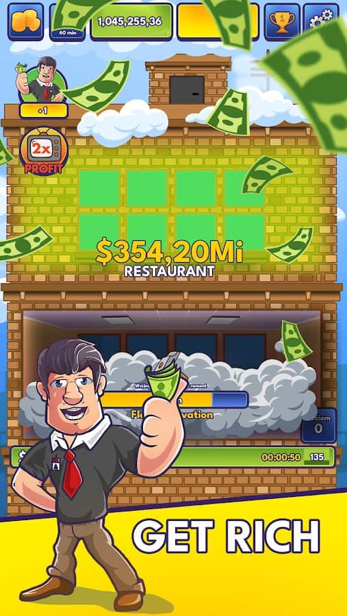 Gökdelen Parası: Cep Kule İnşaatçı Tembel Oyunu - İnşaatçılarla bir sözleşme yapın ve tüm turistlerin buluşacağı harika bir bina inşa etmeye başlayın! 100'den fazla kat, kafeler, restoranlar, bilgisayarlar, kuru temizlemeciler, müzeler, kıyafet tamirleri, bakkallar, hastane bölümleri, müzik stüdyoları ve hatta donut dükkanları gibi çeşitli işletmelerle dolacak. Ufukta daha fazla kat belirdikçe, şehirdeki kazanç ve popülarite de artar. Arkadaşlarınızla bir araya gelin ve gökdelenleri uzaya kadar inşa edin. Ya da sadece oraya ulaşmaya çalışın.