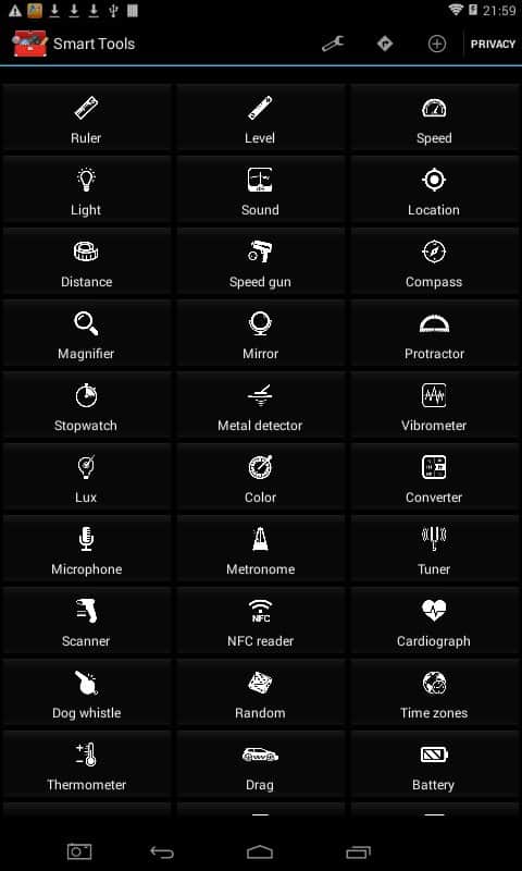 Akıllı Araçlar - Tek bir uygulamada birçok farklı araç, burada neredeyse her şey ve her durum için var. El fenerinden navigatöre kadar, hepsi kullanışlı bir şekilde bir araya getirilmiş ve bölünmüştür. Tüm cihazlar mükemmel bir şekilde işlevlerini yerine getirir ve akıllı telefonunuzun bileşenlerini kullanarak çalışır. Ayrıca, veri hesaplama için birden fazla formatı ve birçok dili desteklediğini belirtmek gerekir, bu da uygulama ile çalışmayı önemli ölçüde kolaylaştırır.