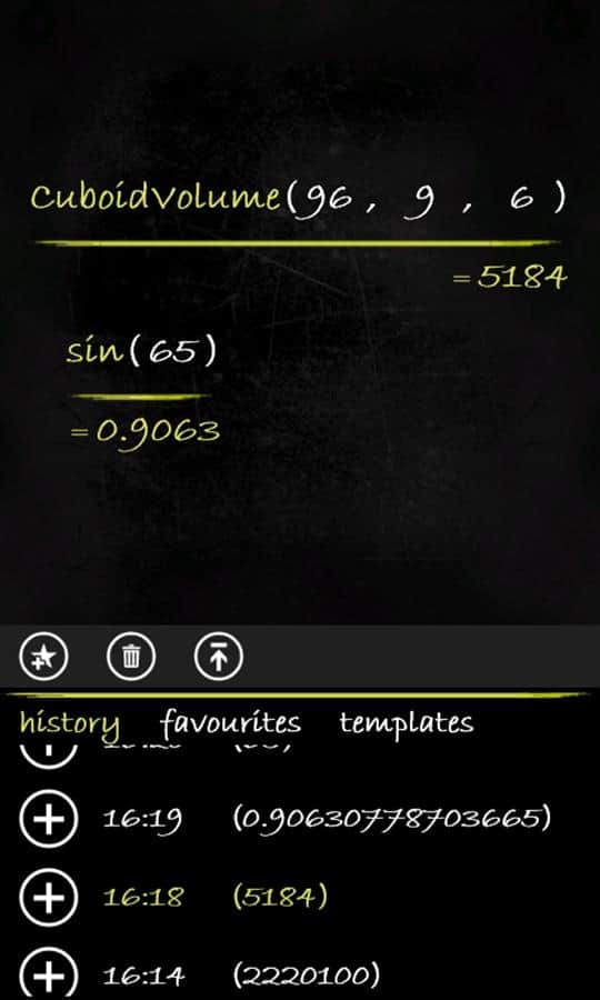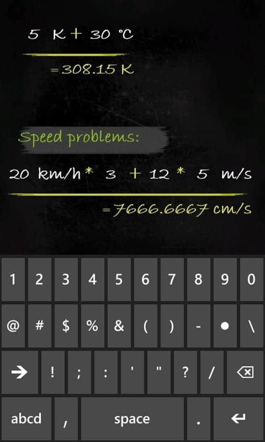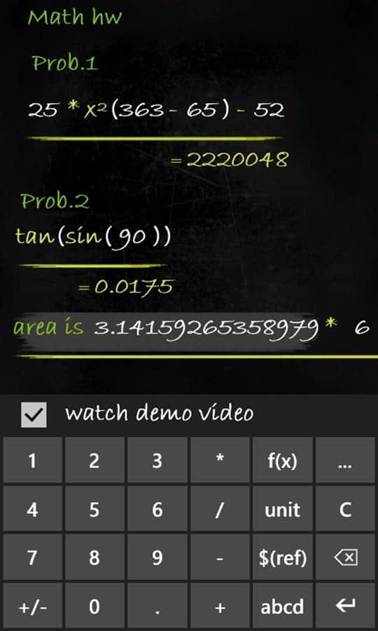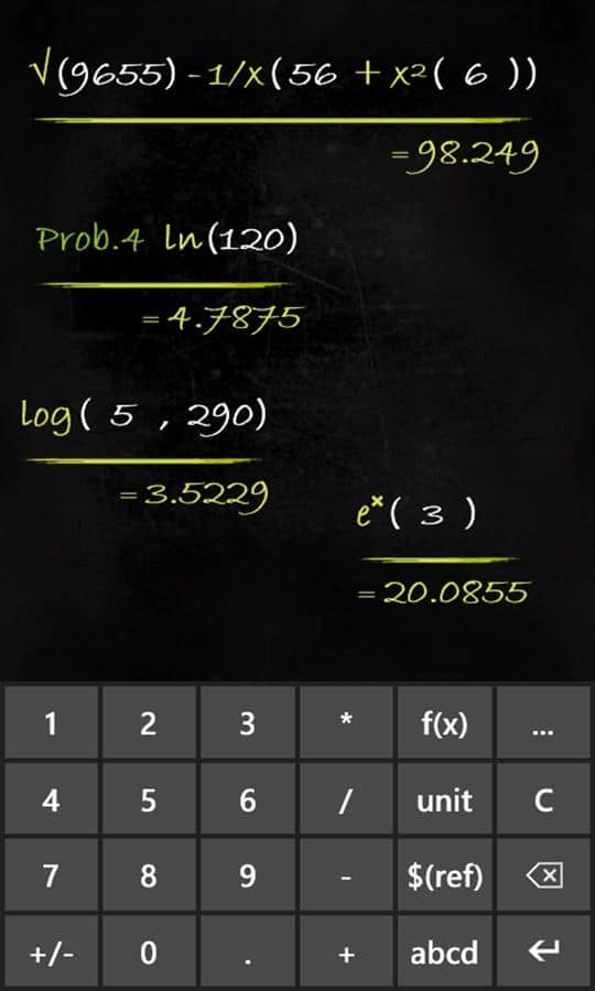 Akıllı Tahta Hesap Makinesi - Windows Phone için çok fonksiyonlu bir hesap makinesidir. Hesap makinesi, cebir, geometri, trigonometrik ve istatistiksel hesaplamaları yapabileceğiniz bir tahtadır. Ayrıca zaman, mesafe, hız, ağırlık, sıcaklık, enerji, basınç ve daha fazlası gibi birimleri de içerir. Özelliği, tüm ifadeleri ve sonuçları tahtada olduğu gibi görebilmenizdir. Yazdığınız tüm hesaplamalar, herhangi bir anda geçmişi kullanarak geri yüklenebilir. Arkadaşlarınıza göstermek isteyeceğiniz orijinal bir hesap makinesi.
