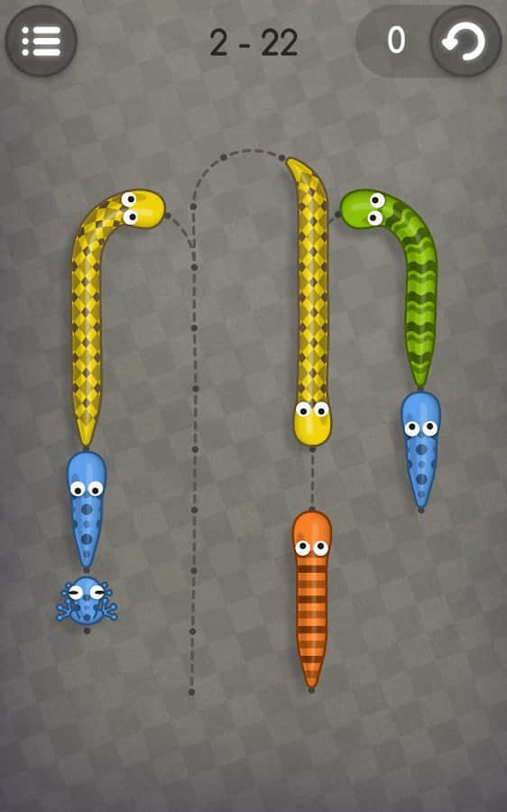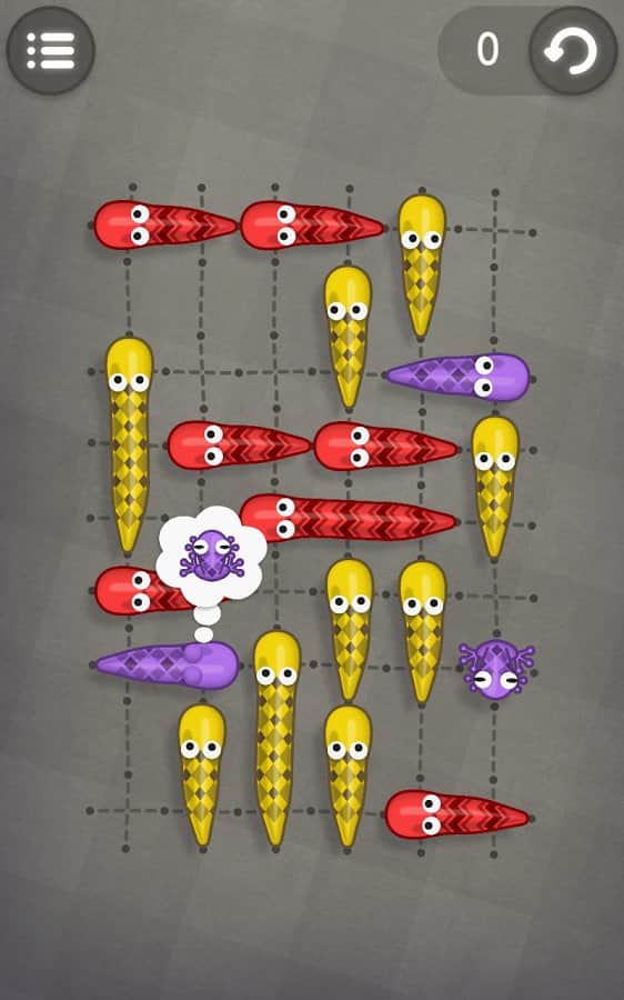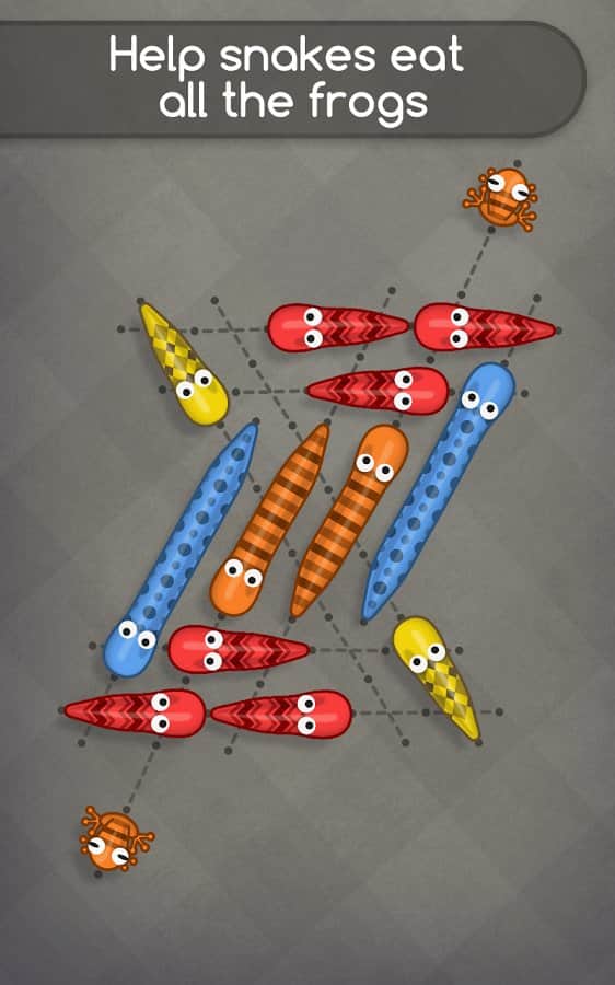 Yılanlar Kurbağaları Sever - Android için bir oyun, burada yılanları en sevdikleri kurbağalarla beslemeniz gerekiyor. Bunun için birçok zor bulmacayı çözmeniz gerekecek. Yılanları yollarında hareket ettirin ve sadece yılanla aynı renkteki kurbağaları yiyin. Her seviyede tüm mantıksal düşüncenizi kullanarak üç yıldız kazanın.