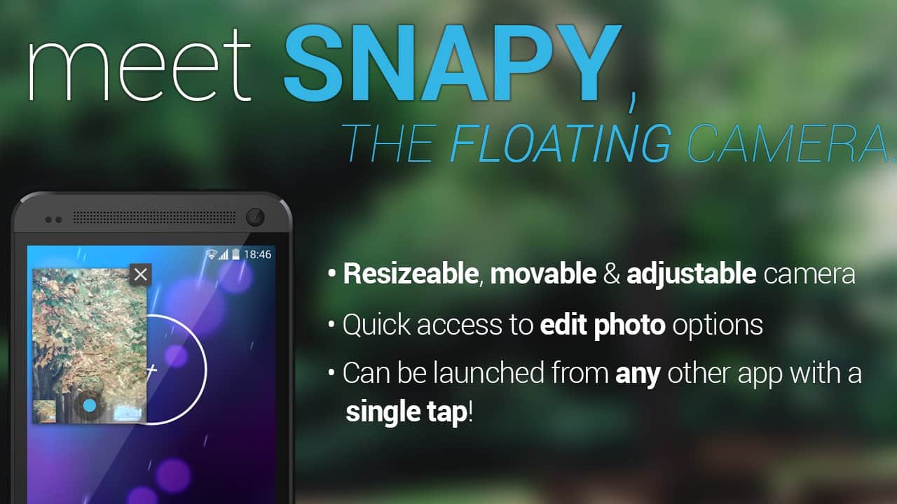 Snapy, Yüzen Kamera – hayatınızdaki önemli anları asla kaçırmayacağınız yüzen kamera ile harika ve çok kullanışlı bir uygulama. Program, diğer herhangi bir uygulamadan başlatılabilir, boyutunu ve konumunu sizin için uygun bir yere değiştirme imkanı vardır. Ayrıca, kameranın tek bir dokunuşla başlatıldığını belirtmek gerekir. Harika anlar ve iyi ruh hali!