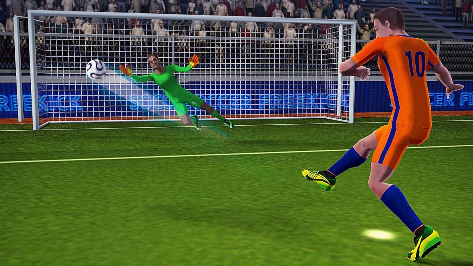 Futbol Dünya Ligi Serbest Vuruş – Android'de oynanan bir spor oyunudur, burada kaleci veya forvet rolünde olacaksınız. Takımınızı sahaya çıkarın ve maçın sonucunu belirleyecek penaltı atışları yapın. En sevdiğiniz futbol takımını seçin ve onu dünya şampiyonasında zaferle taçlandırın. Telefon ekranınıza parmağınızla dokunun ve topun uçuş yolunu tam olarak çizin, ayrıca vuruş gücünü de hesaplamayı unutmayın. Sıralanmış savunma oyuncularını geçin ve hedefi tam olarak vurun, taraftarları sevindirerek goller atın. Kalenizi gollere karşı koruyun, direği farklı yönlere kaydırarak.