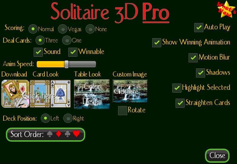 Solitaire 3D - Android için bir solitaire oyunu, artık telefonunuzda da oynayabilirsiniz. Zaman öldürmek için harika bir oyun, yeni özellikler ve modlarla dolu. Tamamen 3D grafikler ve animasyonlarla, bu oyunda arka plan resmi seçme ve kartların arka yüzlerini değiştirme imkanınız olacak. Oyunda ayrıca ileri, geri butonları mevcut ve beğendiğiniz bir turu tekrar oynama seçeneği de var. Daha deneyimli oyuncular için oyunun zorluğunu artırma imkanı sunulmaktadır.