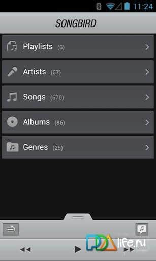 Songbird – Android akıllı telefonunuz veya tabletiniz için şık bir medya oynatıcıdır. Çok basit ve erişilebilir bir arayüze sahiptir, ayrıca müzikleri kolayca gözden geçirmenize ve çalma kontrolü yapmanıza olanak tanır. Beğendiğiniz parçayı zil sesi olarak ayarlayabilirsiniz. Kendi zevkinize ve ruh halinize göre çalma listeleri oluşturun ve düzenleyin. Songbird'in özelliklerinden biri de kulaklık desteğidir (kablolu ve Bluetooth), tam fonksiyonlu arama ve albüm kapağı ile ilgili bir widget içerir.