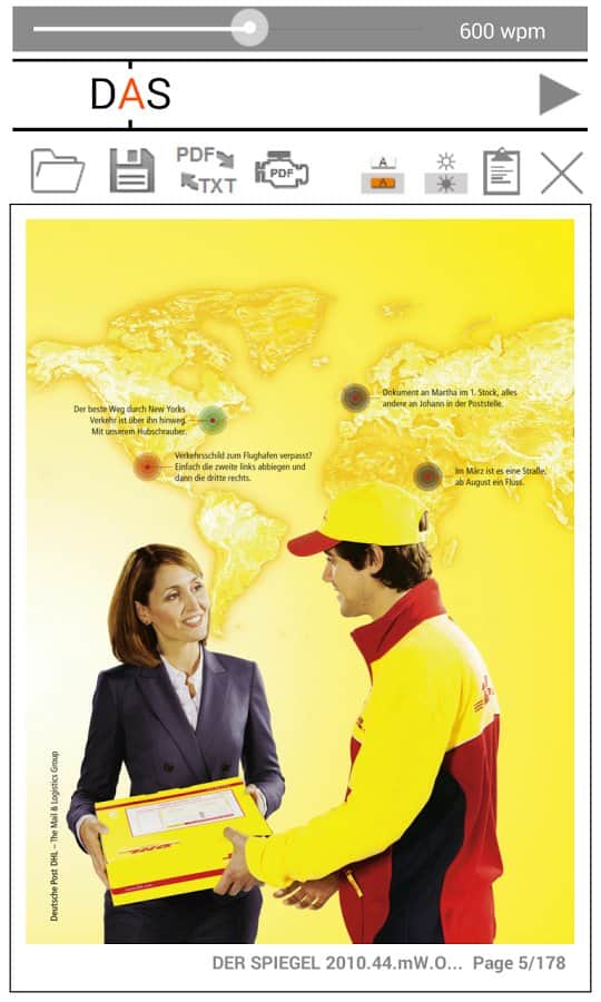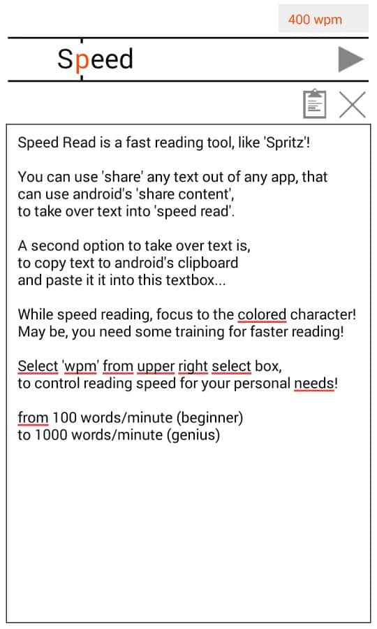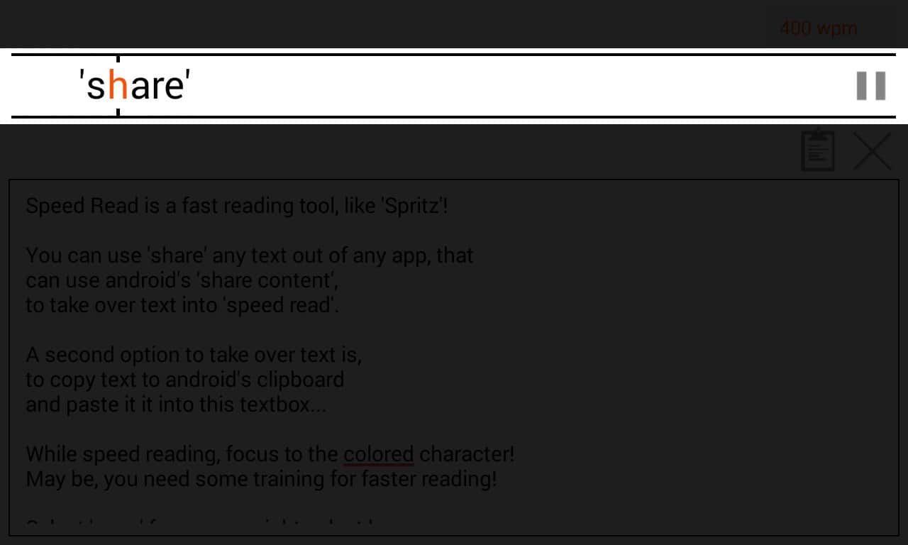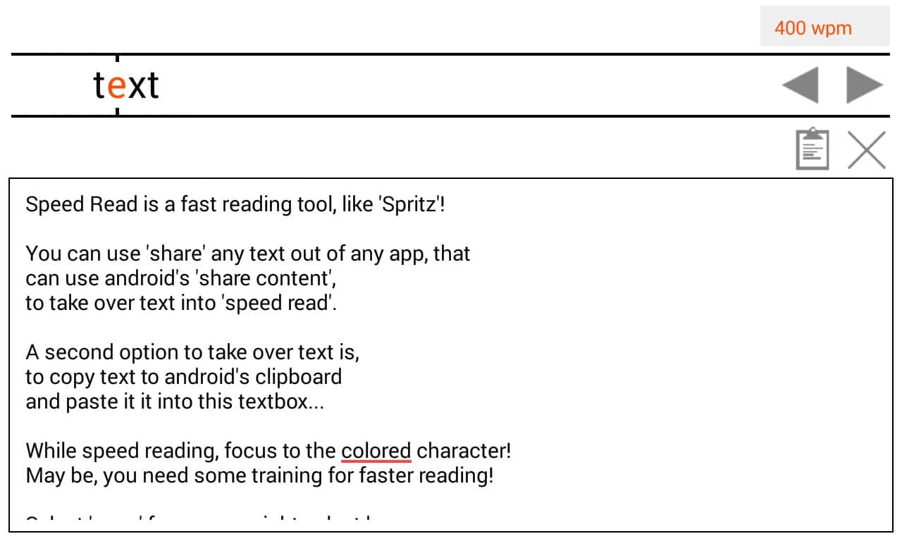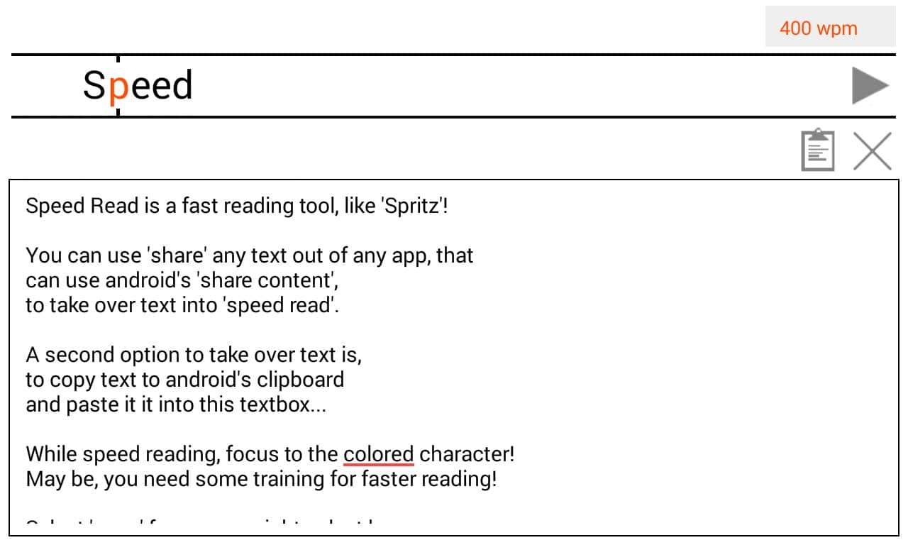 Spritz'ten ilham alan Hızlı Okuma! – çeşitli makaleleri ve edebi metinleri hızlı okumayı sevenler için cihazınızda mükemmel bir Android uygulaması. Nasıl çalışır: uygulamanın alanı, kelimeleri ekranda üstte birer birer gösterirken, okuduğunuz metnin tam metni yanıp sönen kelimelerin altında görünür ve üstte görüntülenen her kelimeyi vurgular. Uygulama, Speed Read inspired by Spritz! kullanıcısını kayıtsız bırakmayacak birçok farklı özellik ve olanak içeriyor.