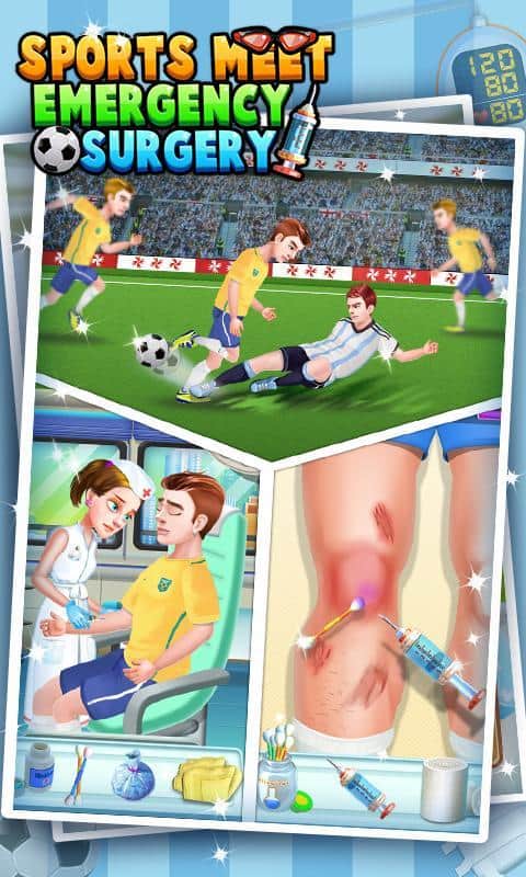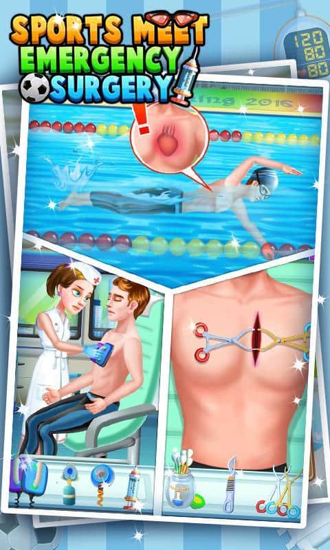 Spor Toplantısı Acil Cerrahi – Android için etkileyici bir oyun, burada sporculara yardım edecek ve yaralarını iyileştireceksiniz. Bu oyunda iki oyun senaryosu bulunmaktadır; ilki, oyunda sakatlanan bir futbolcuya bacak üzerinde acil ameliyat yapmasına yardımcı olacaksınız. Futbolcu sakatlandı, 911'i arayın ve ambulans çağırın. Hastanın acil tedaviye ihtiyacı var, onu hastaneye götürün, ameliyathaneyi hazırlayın ve ameliyatı gerçekleştirin. Oyunun ikinci aşamasında, bayılan bir yüzücüye ilk yardım yapacak ve yapay solunum uygulayacaksınız. Hastayı hastaneye götürün ve kalp üzerinde acil ameliyat yapın. İki sporcunun ameliyatını yapmalarına ve yeniden ayağa kalkmalarına yardım edin.