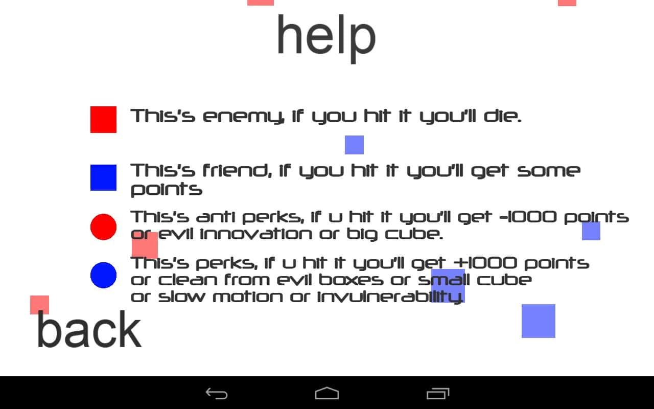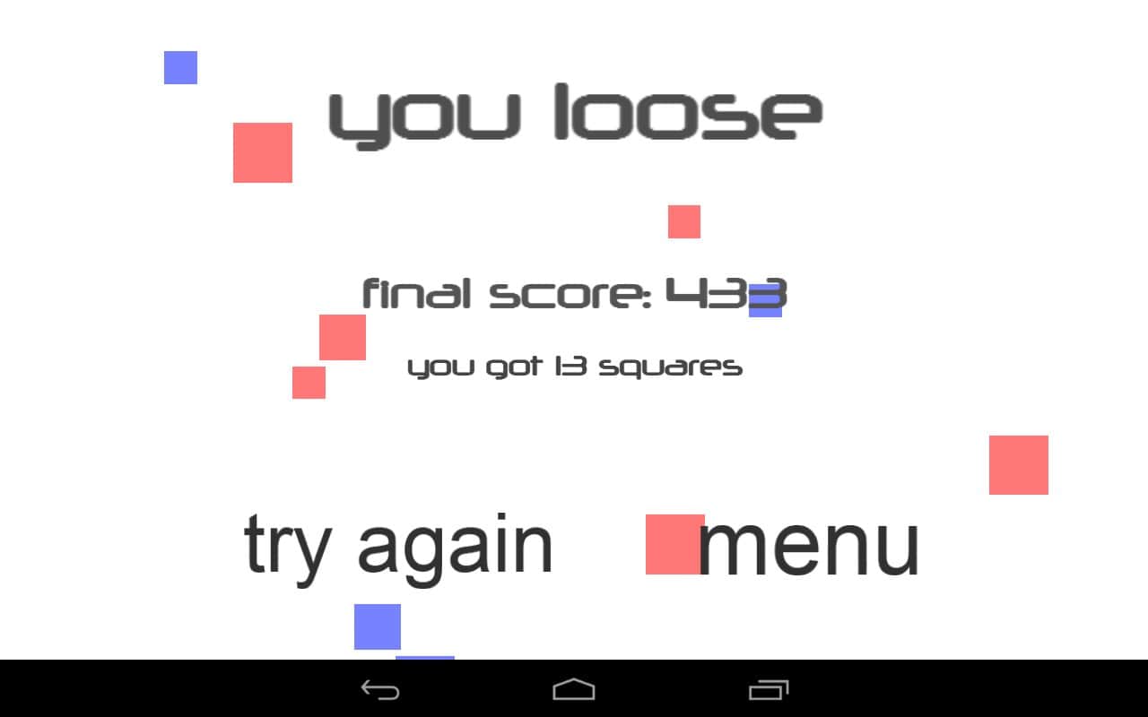 Kareler - benzersiz bir oyun deneyimi sunan Android oyunu. Mavi renkteki uçan kareyi kontrol etmeniz gerekiyor. Görünüşte bu kadar basit, ama karşınıza kırmızı kareler gibi çeşitli engeller çıkacak, onlara çarpmanız kare boyunuzu artıracak. Renklerinizdeki kareler ise size bağışıklık ve yavaşlatma gibi ek fırsatlar sunacak.
