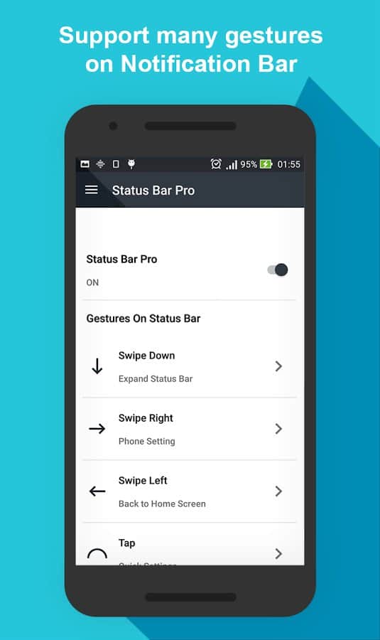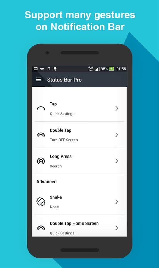 Durum çubuğu, Android akıllı telefonların harika bir icadıdır, çünkü bize birçok yararlı bilgi gösterir. Ancak bu uygulamanın geliştiricileri, onu daha da kullanışlı hale getirmenin bir yolunu buldular. Durum çubuğunda kullanabileceğiniz hareket seti, sizi favori uygulamalara ve ayarlara yönlendirecektir. Sağ, sol kaydırma, dokunma, çift dokunma, uzun basma ve sallama gibi işlemler bulunmaktadır. Onlarla ne kadar çok farklı komut ayarlayabileceğinizi hayal edebiliyor musunuz? Uygulamaların bir kısmını başlatma, hızlı ayarlara geçiş yapma, ekran görüntüsü alma, ekranı kapatma vb. işlemler mümkündür.
