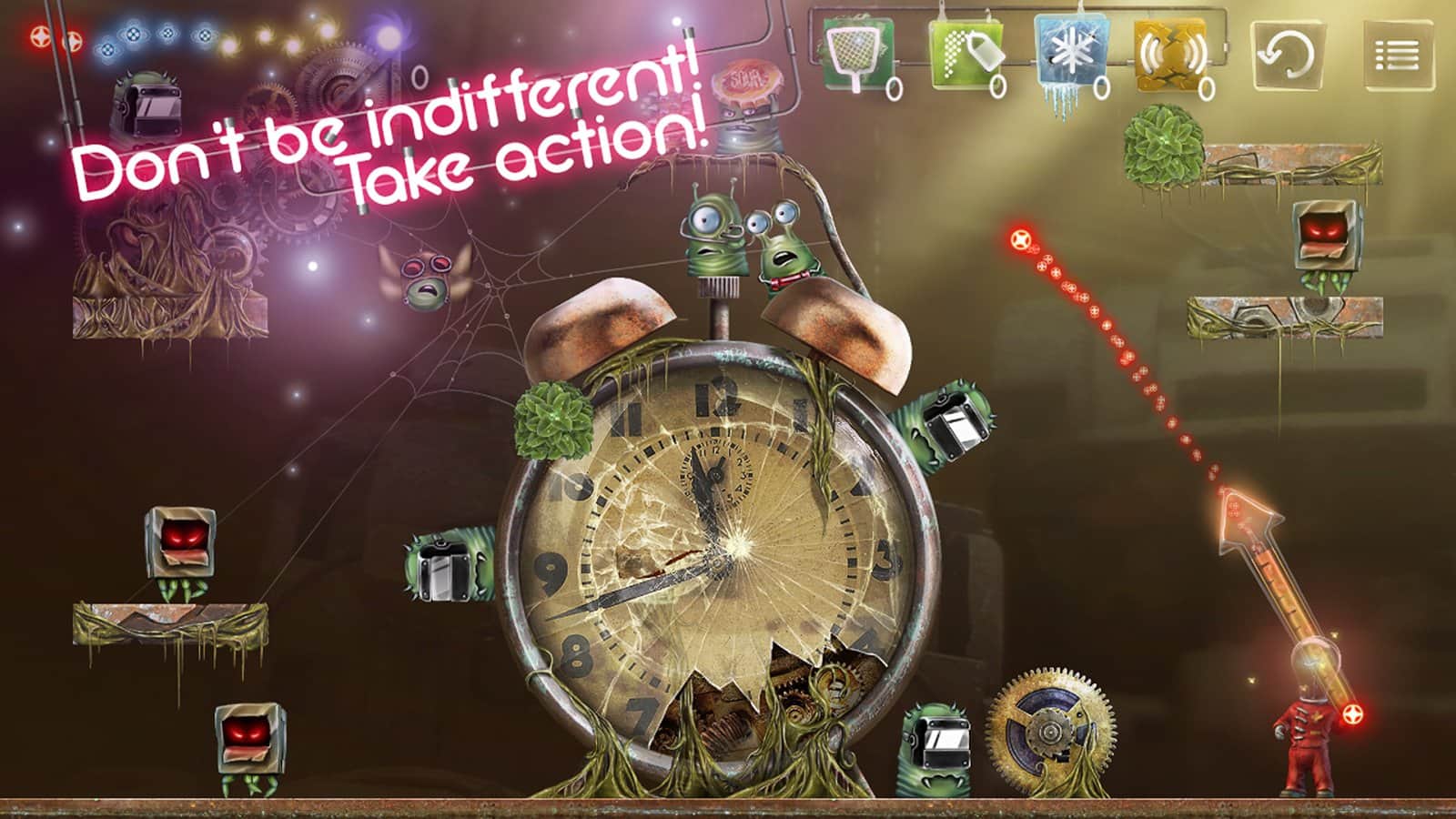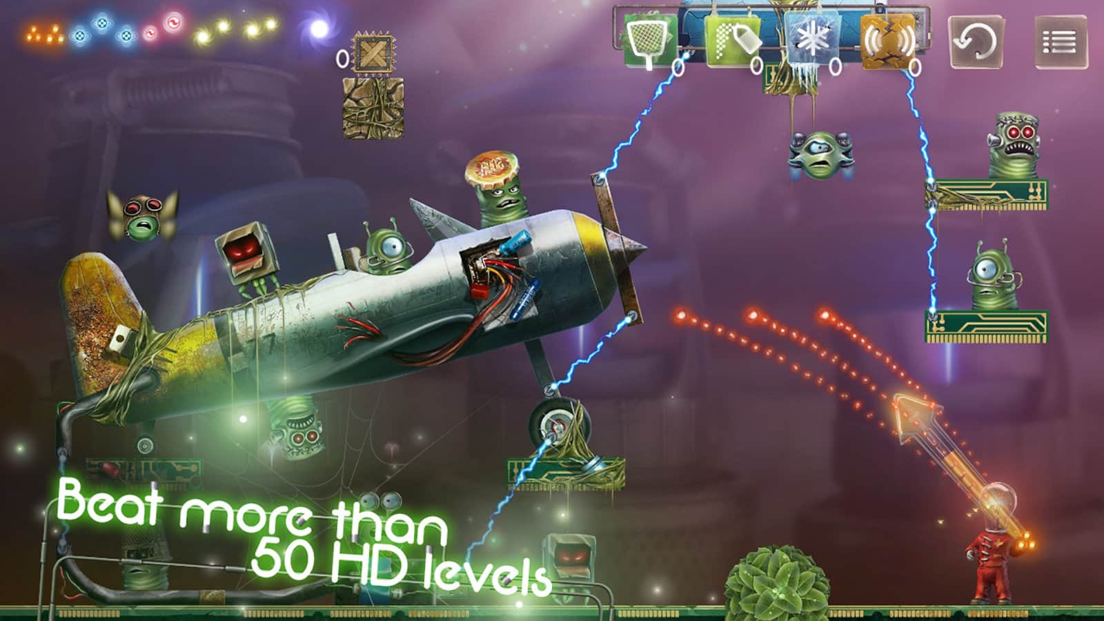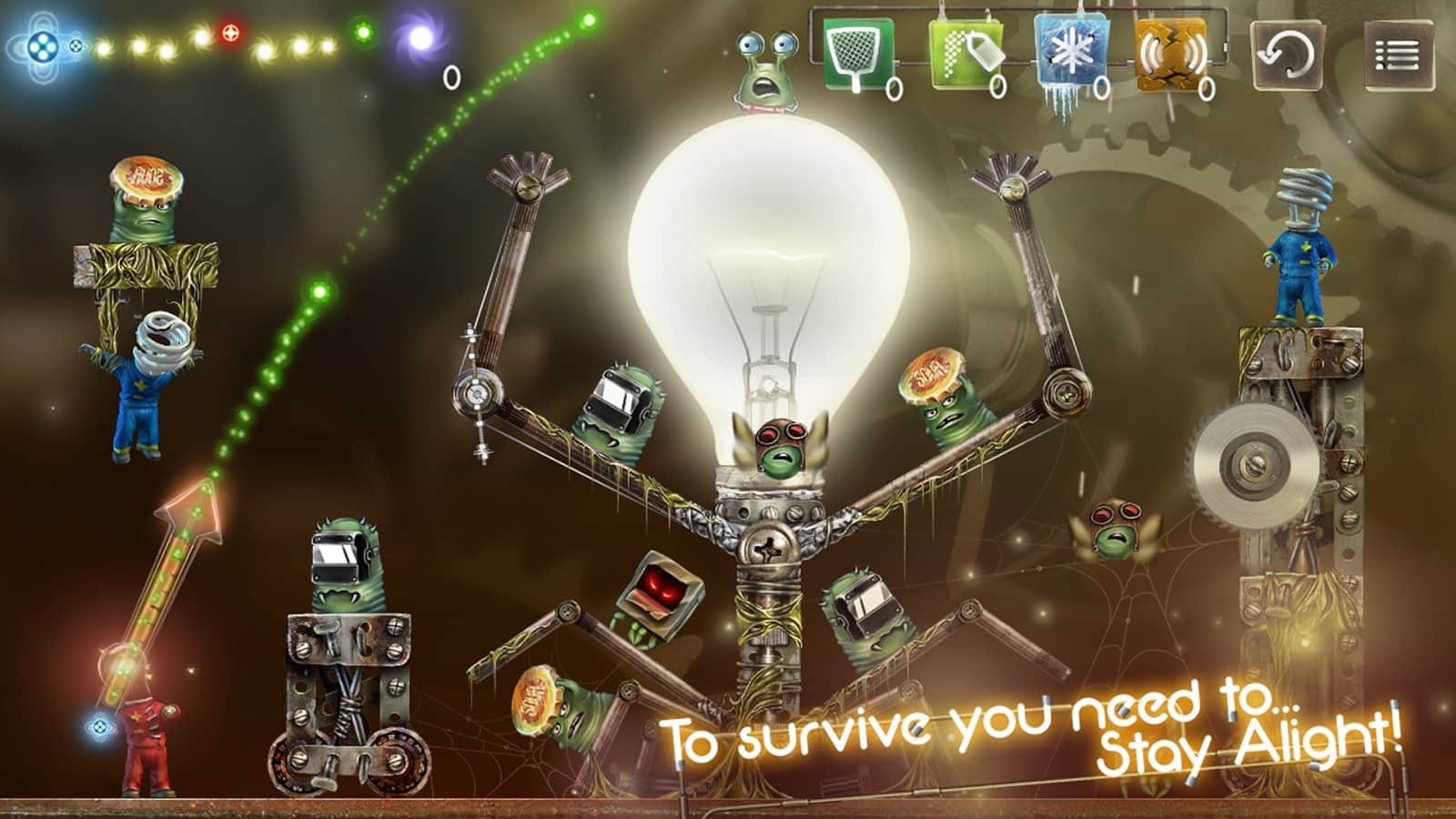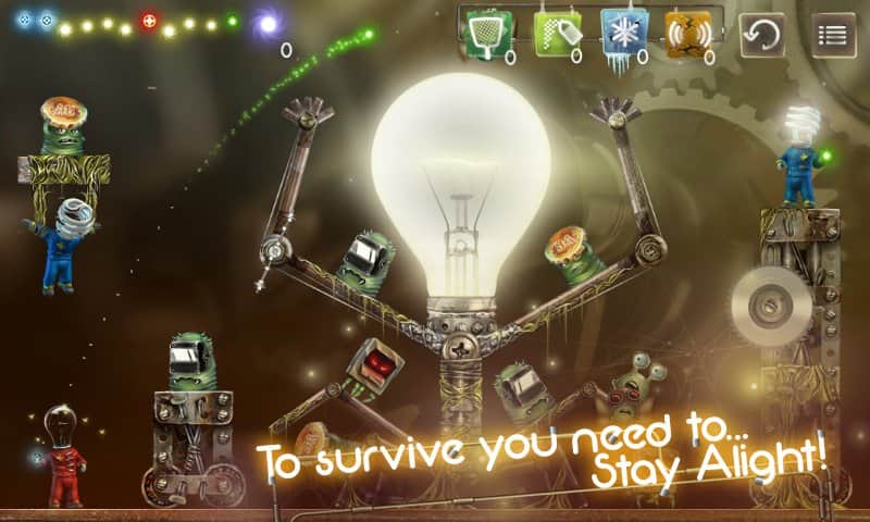 Işıkta Kal - Android için ilginç bir arcade oyunu, sizi ampul insanlarının sıradışı dünyasıyla tanıştıracak. Onlar insanlara benziyor, sadece başlarının yerine ampulleri var. Hayatları da Dünya'ya benziyor, kısacası neredeyse akrabalar. Ve işte bu varlıklara yeşil canavarlar saldırdı. Ancak cesur ampuller paniğe kapılmadı ve işgalcilere karşı onurlu bir direniş göstermeye karar verdiler. Bunun için düşmana bir ampul fırlatmanız gerekiyor, bu esnada darbe gücünü ve uçuş yolunu dikkate almanız, yani yön belirlemeniz gerekiyor. Uzaylılarla yapılan bu 60 seviyelik savaşta yalnızca ampullerle değil, aynı zamanda zor zamanlarda size çok yardımcı olacak süper silahlarla - dondurma ve yer sarsıntısıyla da donatılacaksınız.