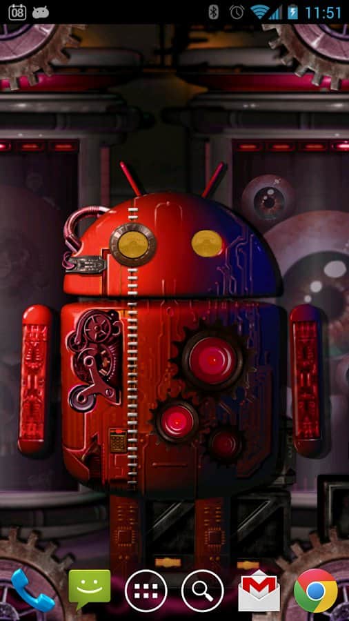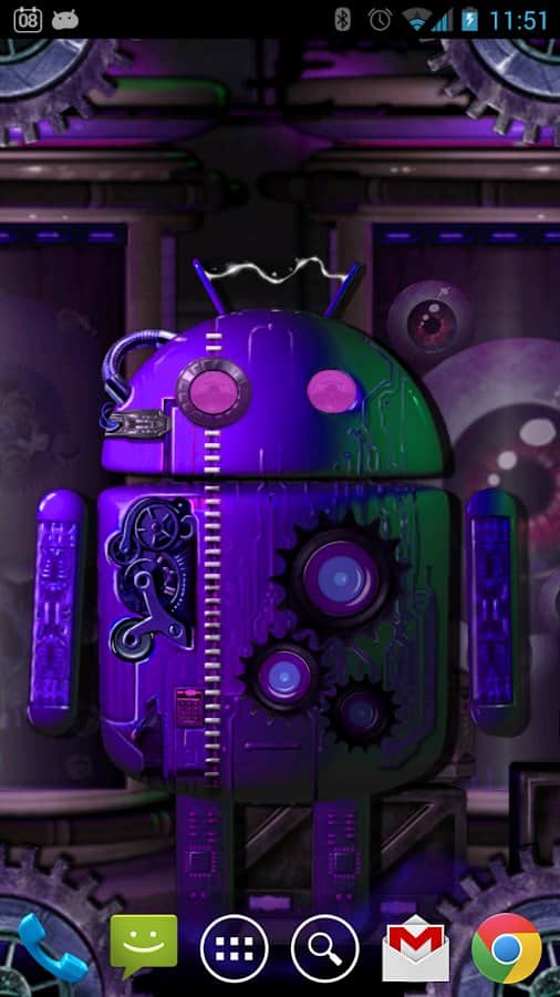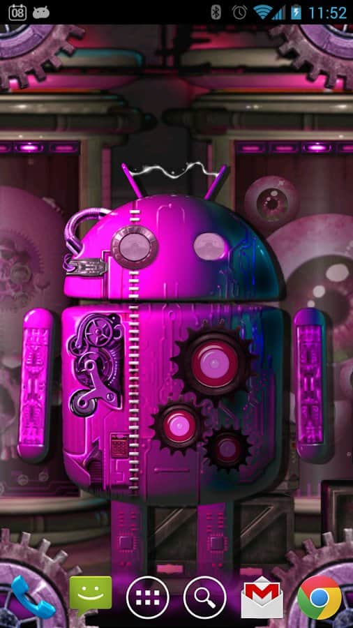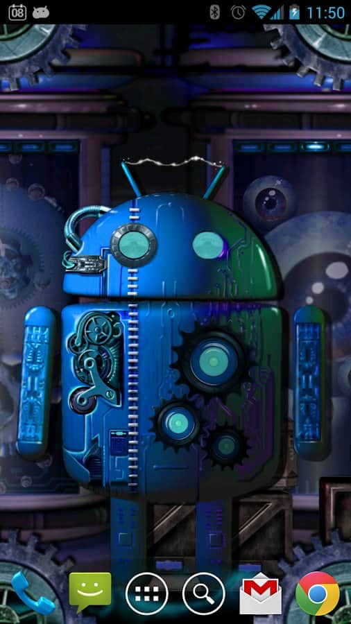Steampunk Droid Korku Laboratuvarı LWP – Android cihazlarınız için steampunk tarzında canlı duvar kağıtları. Eğer bilim kurgu, teknoloji, korku ve droidleri seviyorsanız, bu duvar kağıtları tam size göre. Bu duvar kağıtları sayesinde robotlar üzerinde deneylerin yapıldığı bir laboratuvara gireceksiniz; dönen dişlilerin, kaynayan tankların ve ilginç dokunsal efektlere sahip şişelerin korkutucu ortamını keşfedeceksiniz. Dişliler döner ve telefon ekranınıza yapılan her dokunuşu takip ederken, ekranın ortasında yer alan droid yüz ifadesini değiştirir ve tuhaf mimikler yapar. Canlı duvar kağıtları 7 renk çözümü, paralaks kaydırma ve isteğinize göre birçok ayar sunar.