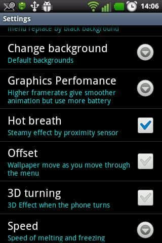 Damlaların oldukça gerçekçi bir tasarımı var, sanki gerçekmiş gibi! Onlarla her şeyi yapabilirsiniz: ekranda kaydırmak, çizmek, birleştirmek, damlalar arasında yarış düzenlemek. Eğer buhar yeterli gelmiyorsa, ekrana olabildiğince yakın bir şekilde nefes alın ve tekrar buğulansın. Bu yüzden, android 2.1 için canlı duvar kağıtlarını indirmenizi ve kendinizi ve arkadaşlarınızı şaşırtmanızı öneriyoruz!
